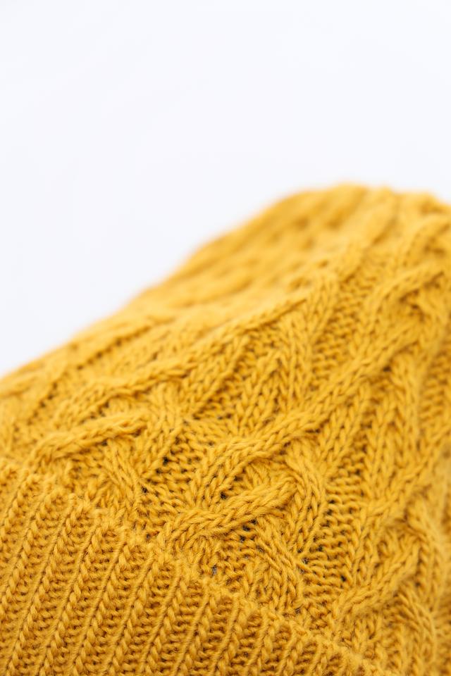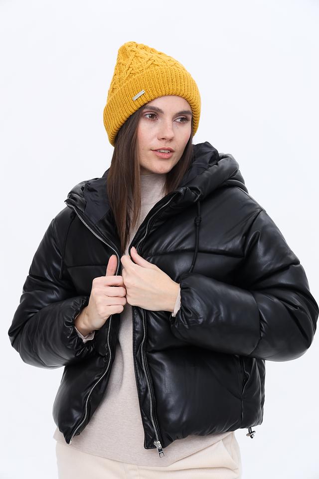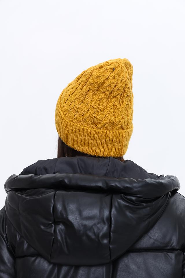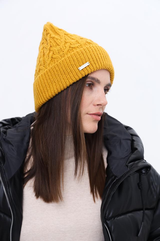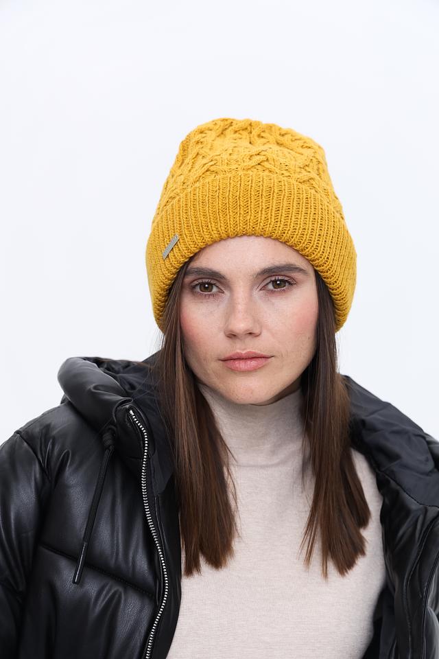 Шапка имеет классическую форму и выполнена в приятном горчичном цвете. Объемный узор "косы" добавляет текстуры и делает эту модель особенно привлекательной. Небольшой металлизированный логотип бренда деликатно размещен на лицевой стороне.