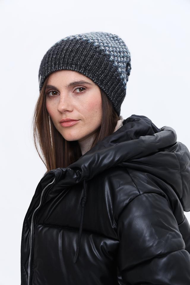 Вязаная текстура шапки придает ей стильный и современный вид. Преобладающий серый цвет с вкраплениями белых и голубых нитей делает её универсальной и легко сочетаемой с различными элементами гардероба.