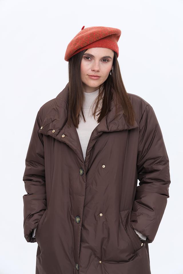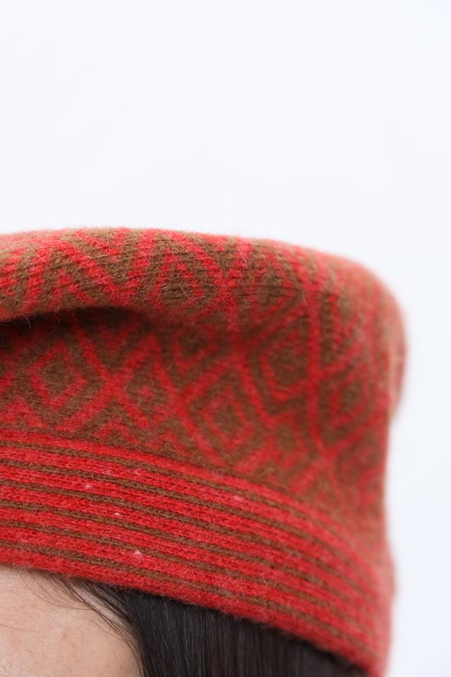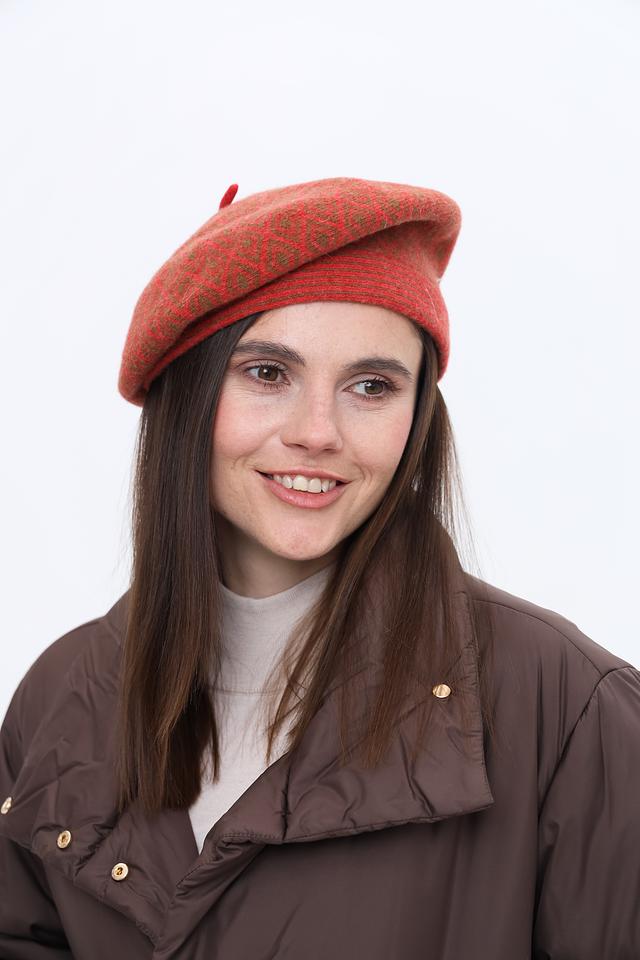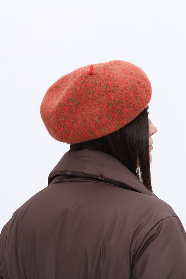 Берет имеет классическую форму и украшен деликатным узором, сочетающим в себе оттенки красного и коричневого. Такой рисунок придает аксессуару особый шарм и индивидуальность.