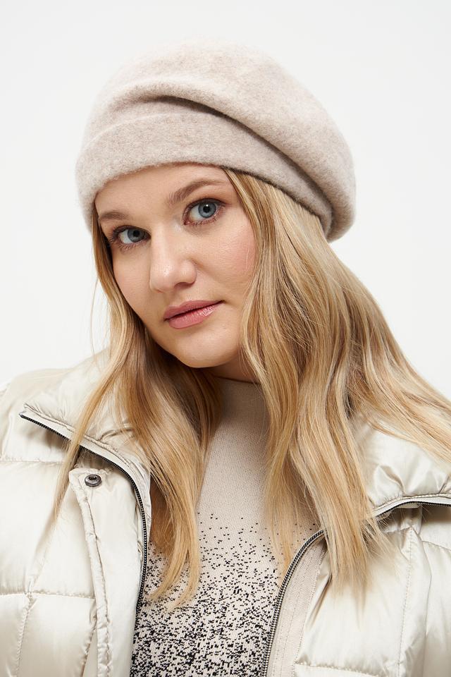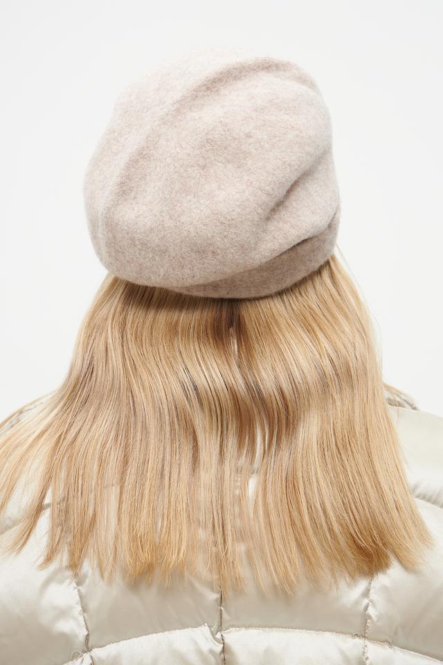Берет имеет классическую форму и нейтральный бежевый цвет, который легко сочетается с различными элементами одежды. Мягкая текстура шерсти приятна на ощупь и не вызывает раздражения.