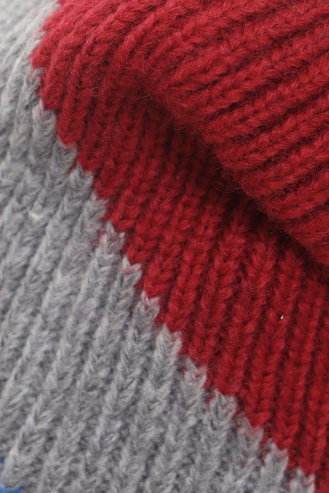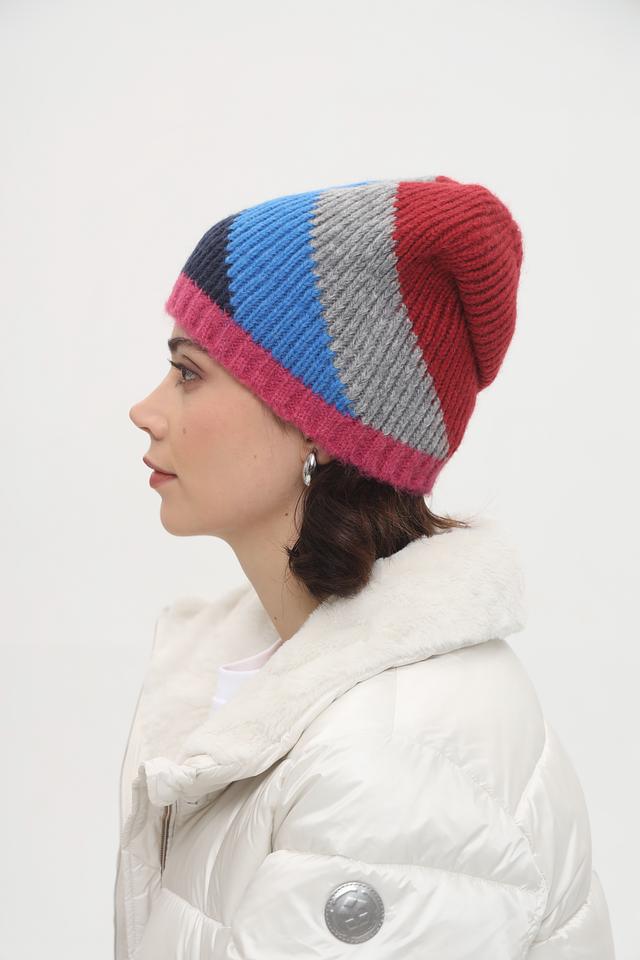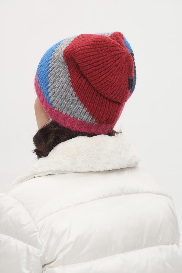 Шапка имеет оригинальный дизайн с крупным геометрическим узором, выполненным в сочетании красного, синего, серого и розового цветов. Такая расцветка добавит индивидуальности и свежести вашему зимнему гардеробу.