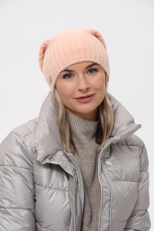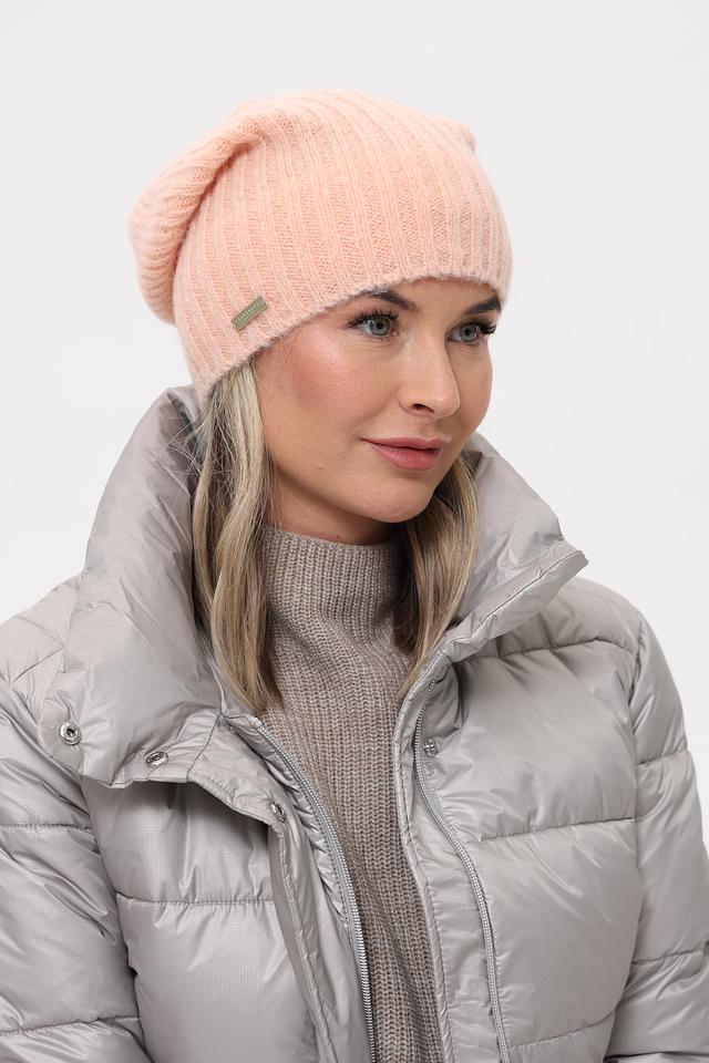 Цвет шапки – нежно-розовый, пудровый оттенок, который легко сочетается с различными элементами гардероба. Шапка имеет классическую форму и плотно прилегает к голове, обеспечивая комфорт и защиту от холода. Небольшой металлический логотип бренда добавляет шапке изысканности.