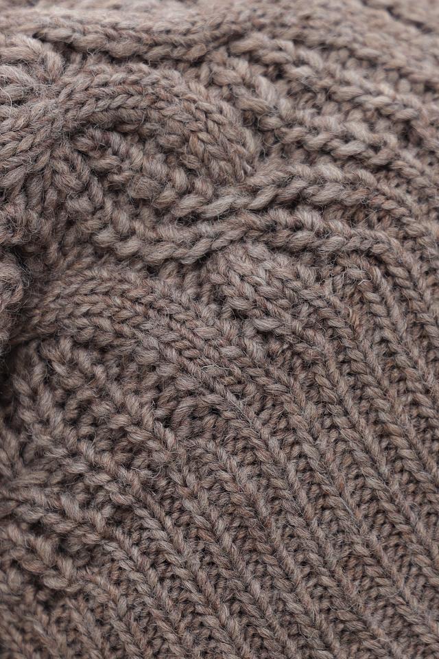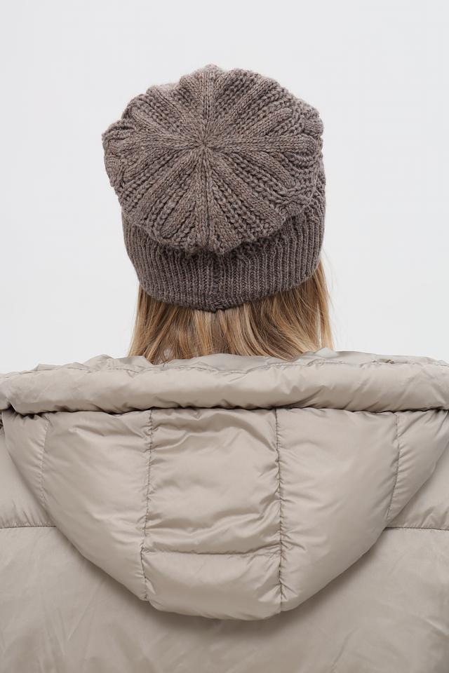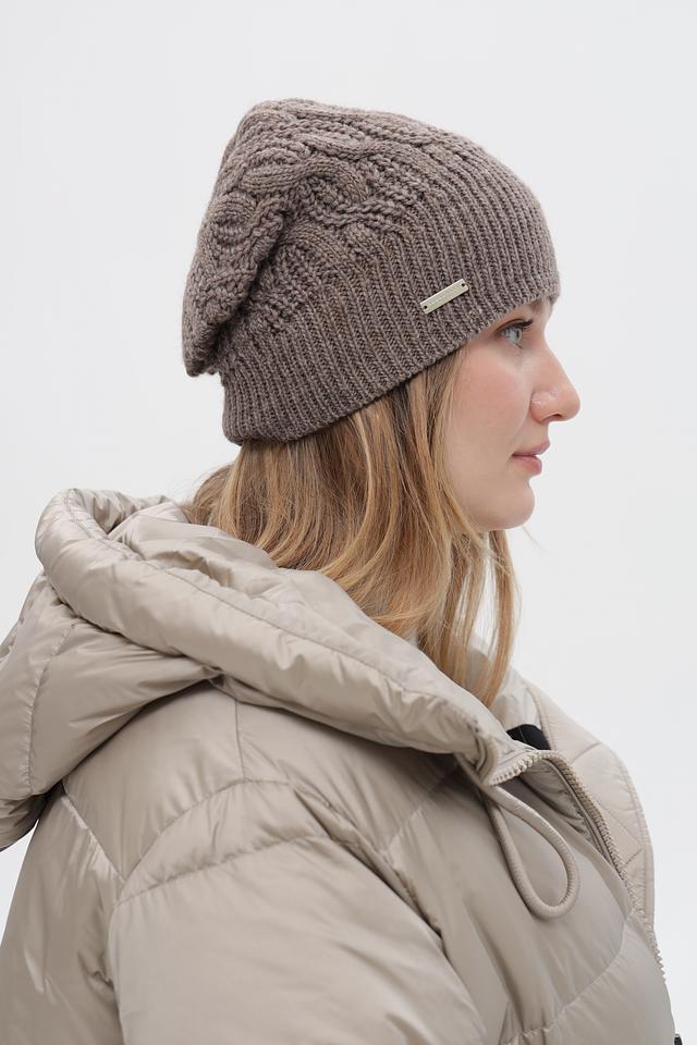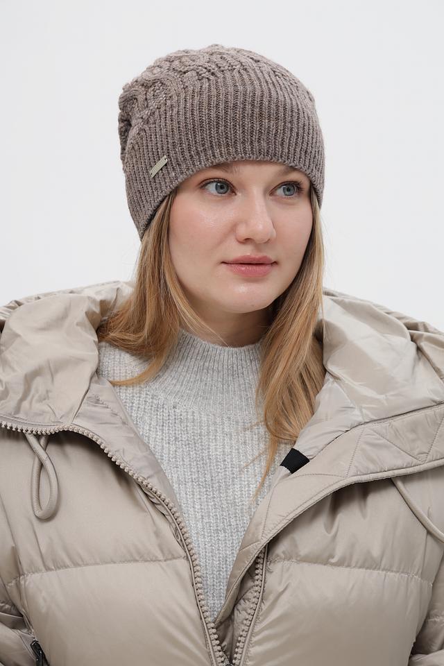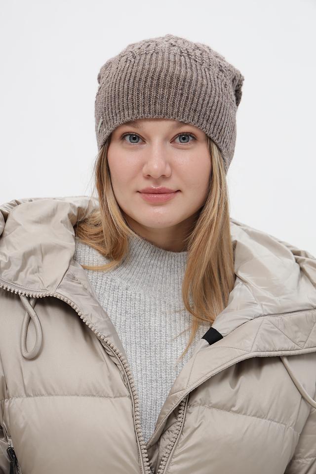 Шапка имеет классический дизайн и приятный бежевый цвет, который легко сочетается с различными стилями одежды. Текстурное вязание придает шапке объем и уютный вид. Небольшой логотип бренда добавляет изысканности.