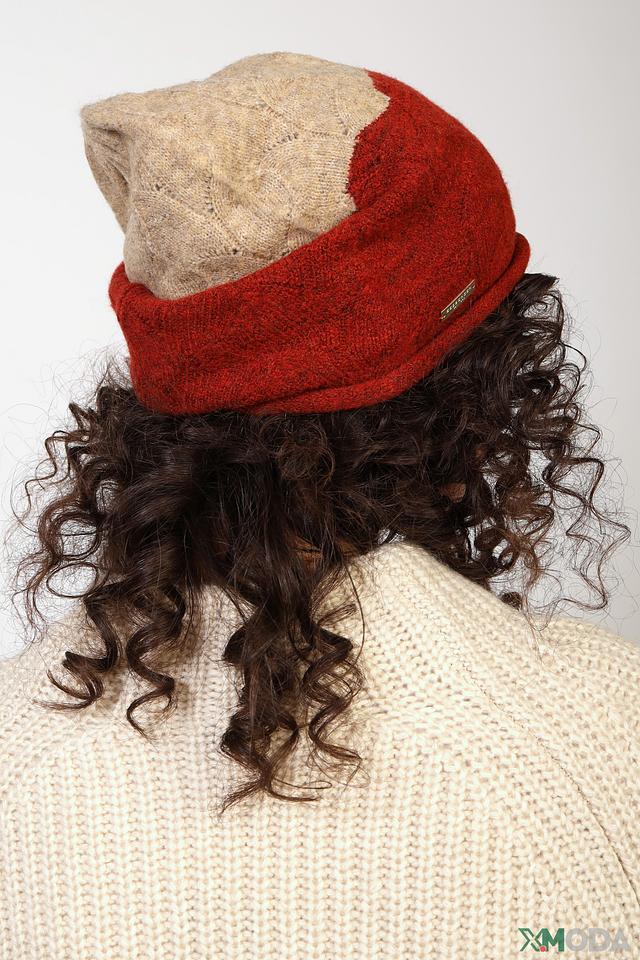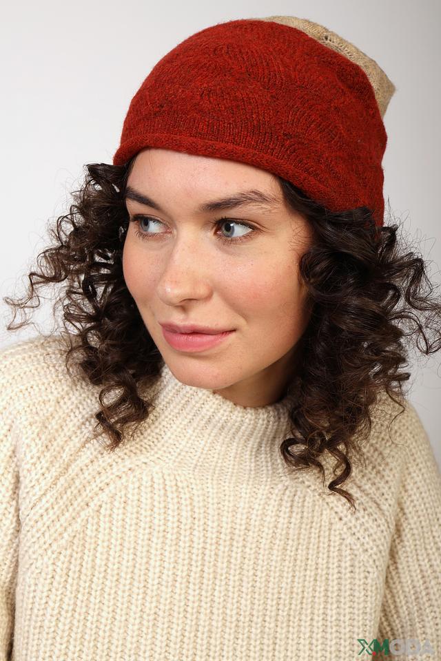 Шапка выполнена в двухцветной гамме: рыжий и бежевый. Такое сочетание делает её яркой и привлекательной. Модель плотно прилегает к голове, защищая от холода и ветра.