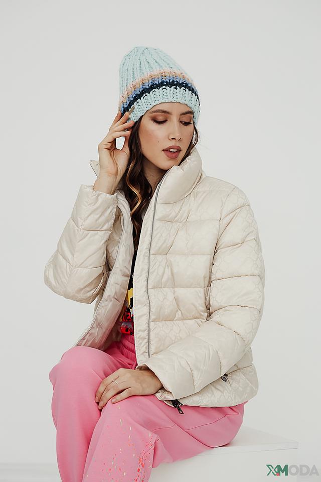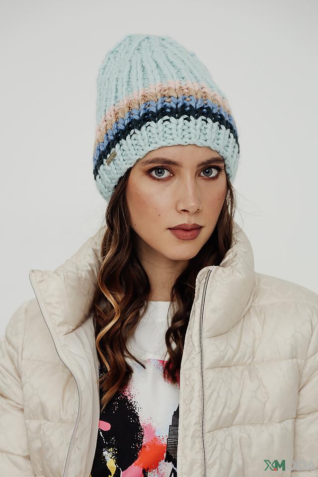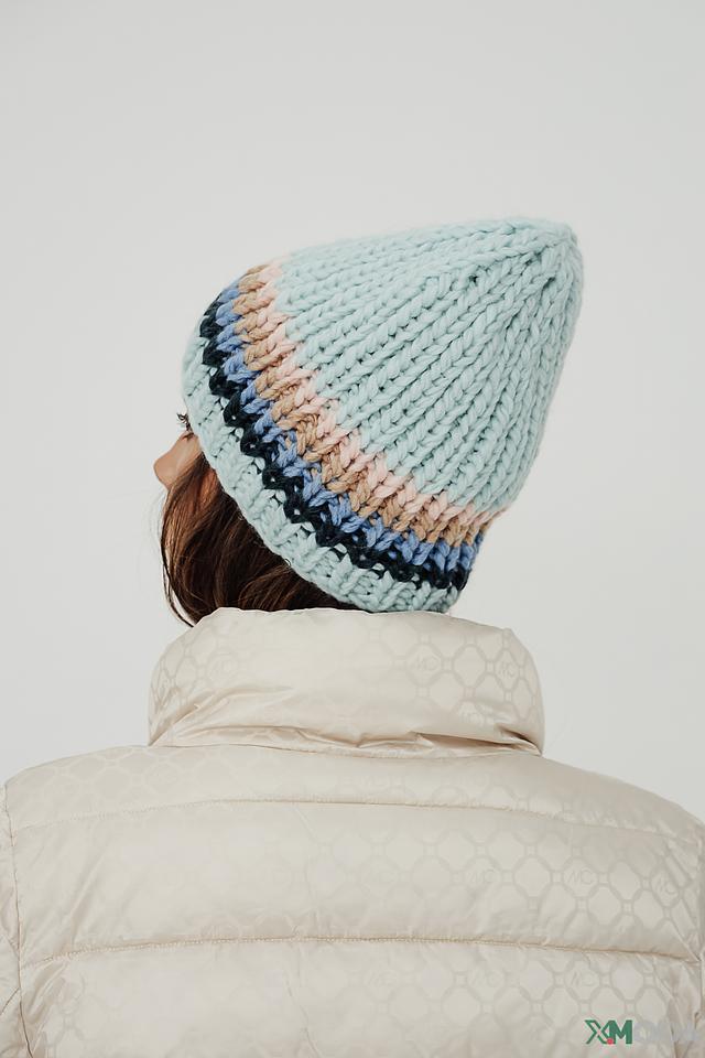 Основной цвет шапки – нежный голубой, который прекрасно сочетается с различными оттенками одежды. Декоративная полоса, выполненная в сочетании розового, голубого и синего цветов, придает шапке оригинальность и индивидуальность.