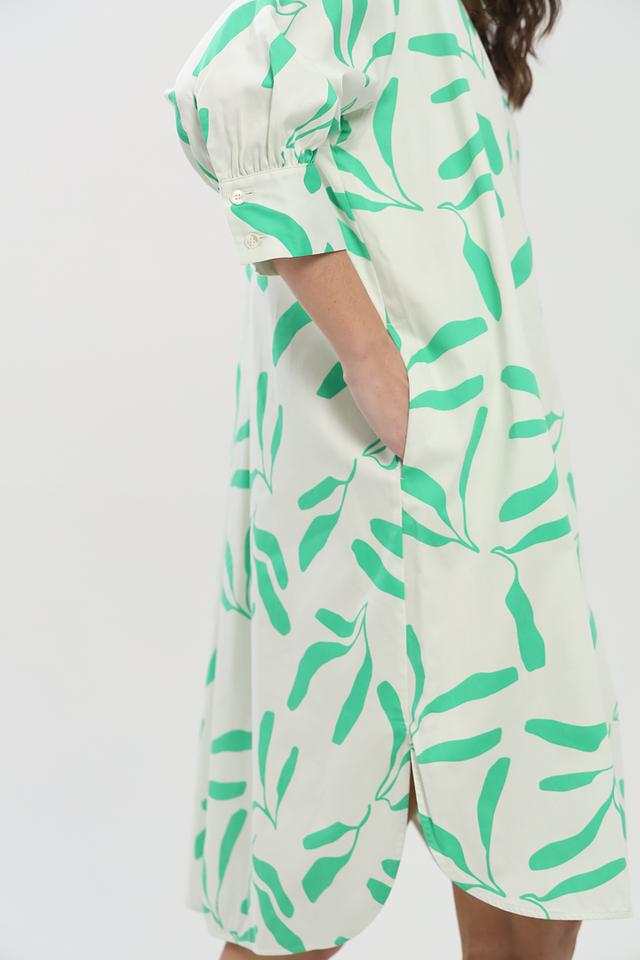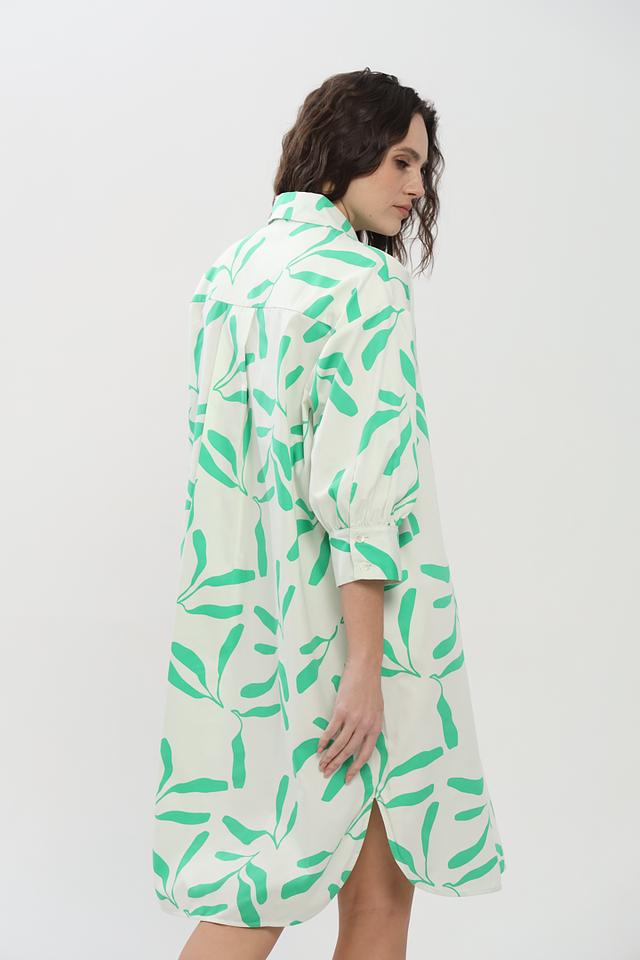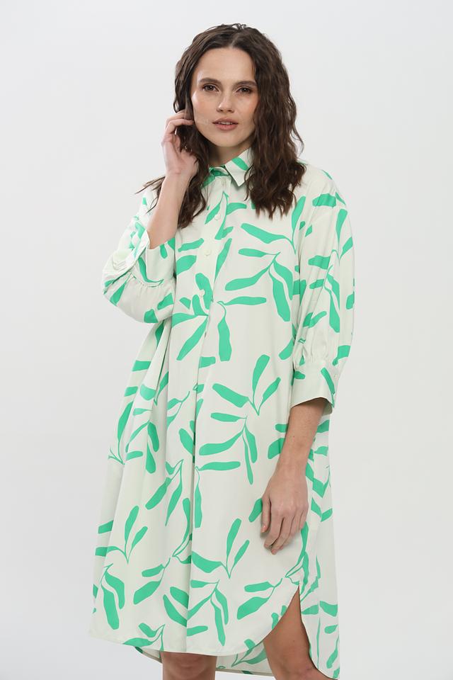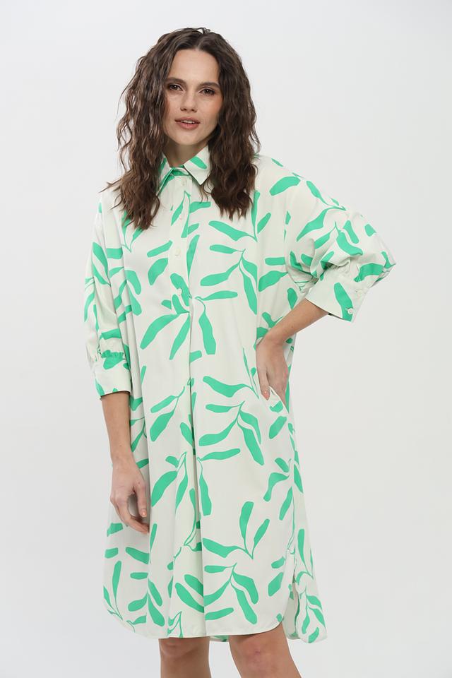 Это платье рубашка от бренда Seidensticker выполнено в светло-зелёном цвете и украшено ярким принтом в виде листьев. Модель имеет прямой крой, воротник рубашечного типа и короткие рукава с манжетами.