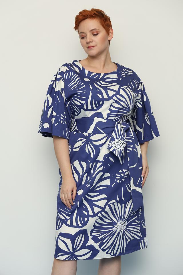 Платье имеет длину миди и слегка расклешенный крой, обеспечивающий свободу движений. Цветочный принт состоит из крупных белых цветов, которые контрастируют с синим фоном, делая образ ярким и запоминающимся. Это платье станет отличным дополнением к вашему гардеробу и подойдёт для различных случаев – от повседневной носки до особых мероприятий.