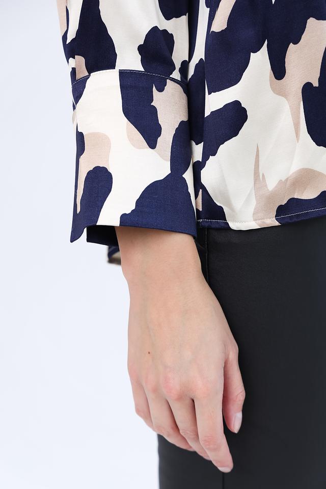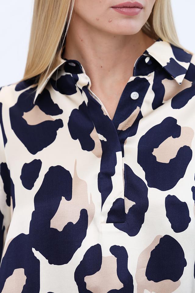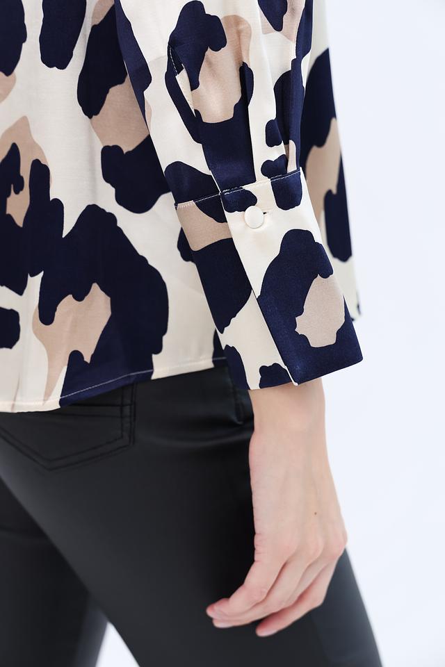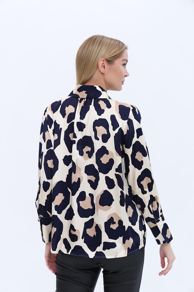 Блуза имеет классический крой с длинными рукавами и отложным воротником. Застежка осуществляется на пуговицы. Особенностью модели является яркий леопардовый принт, сочетающий в себе бежевые, коричневые и темно-синие оттенки.