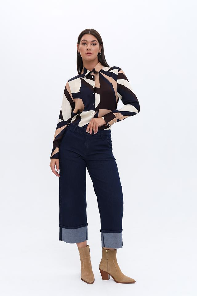 Рубашка имеет классический крой с длинными рукавами и отложным воротником. Особенностью модели является яркий геометрический принт, сочетающий в себе оттенки синего, бежевого и коричневого цветов. Застежка на пуговицы по всей длине.