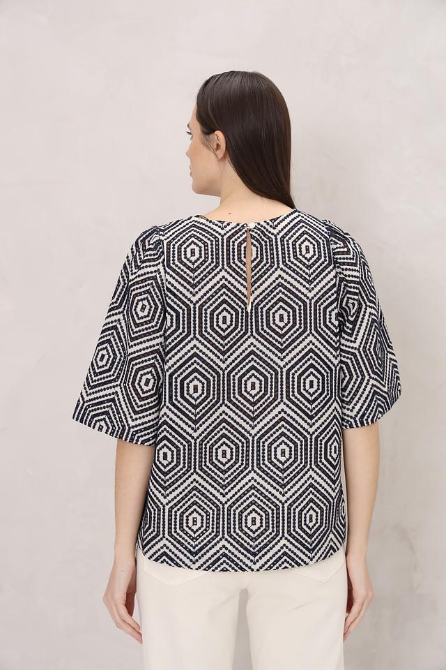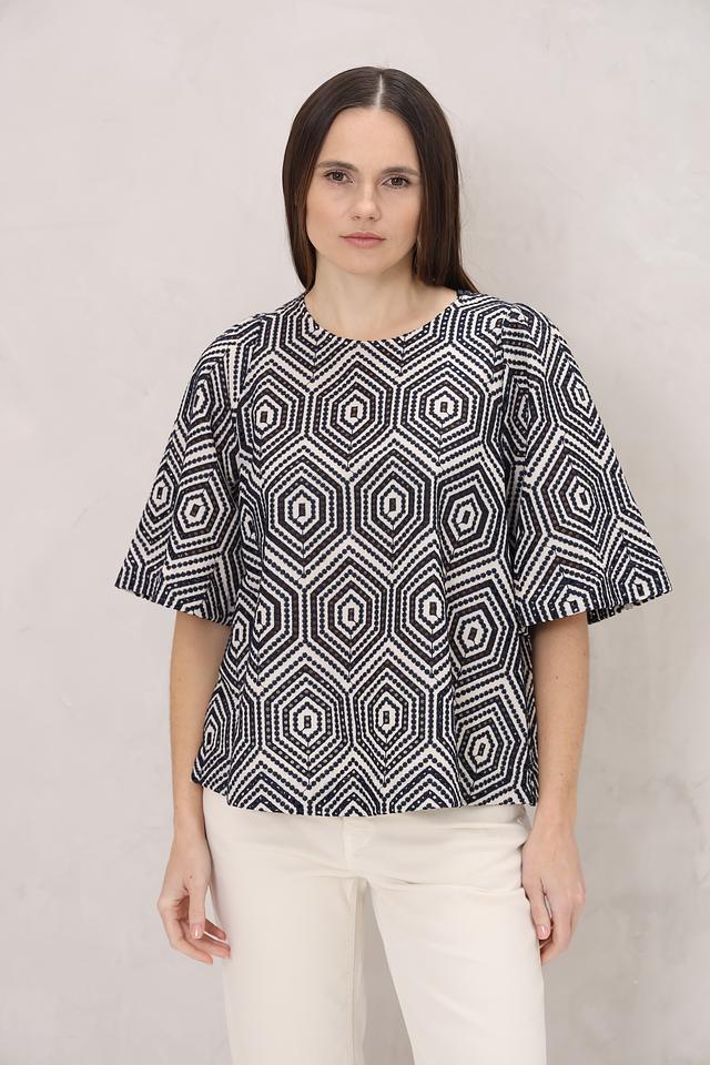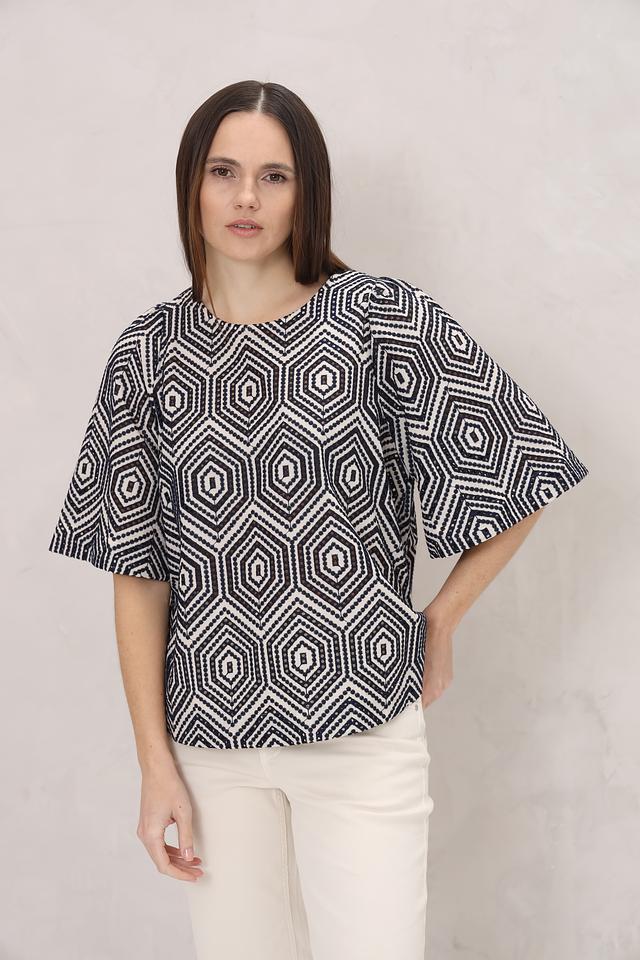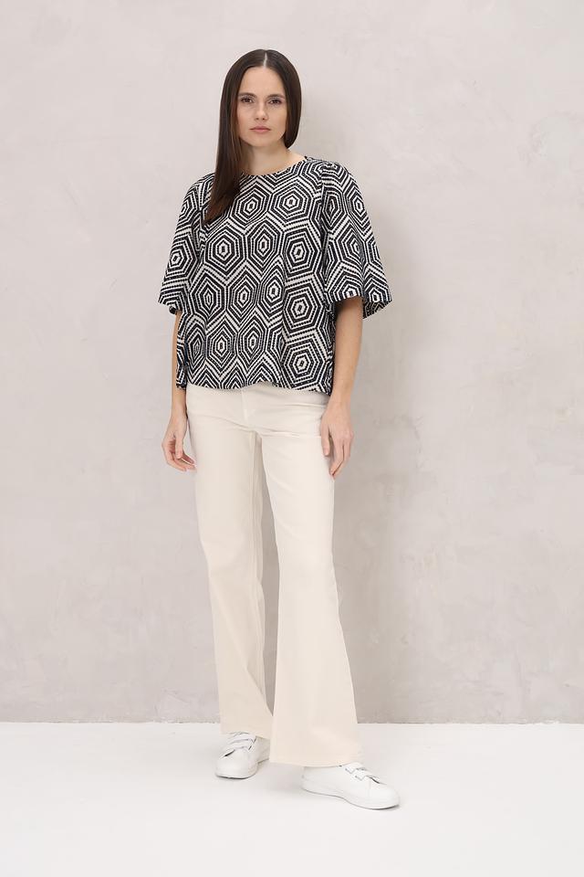 Модель имеет свободный крой и короткие рукава с широкими манжетами, что обеспечивает комфорт и свободу движений. Вырез горловины округлый, декорирован ажурным узором, повторяющим мотив принта. Блуза выполнена из высококачественного хлопка с добавлением небольшого количества полиэстера, что делает ее приятной на ощупь и устойчивой к сминанию.