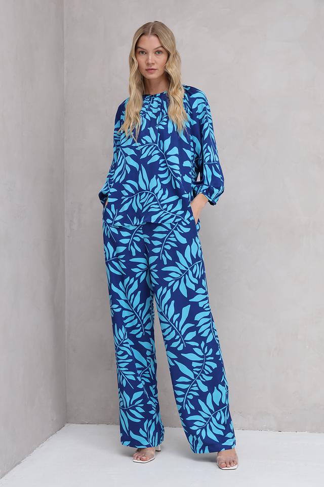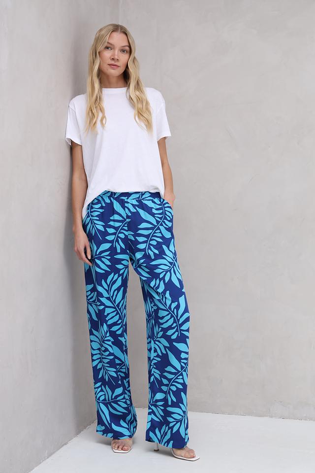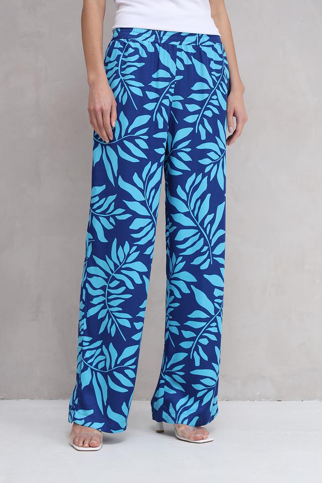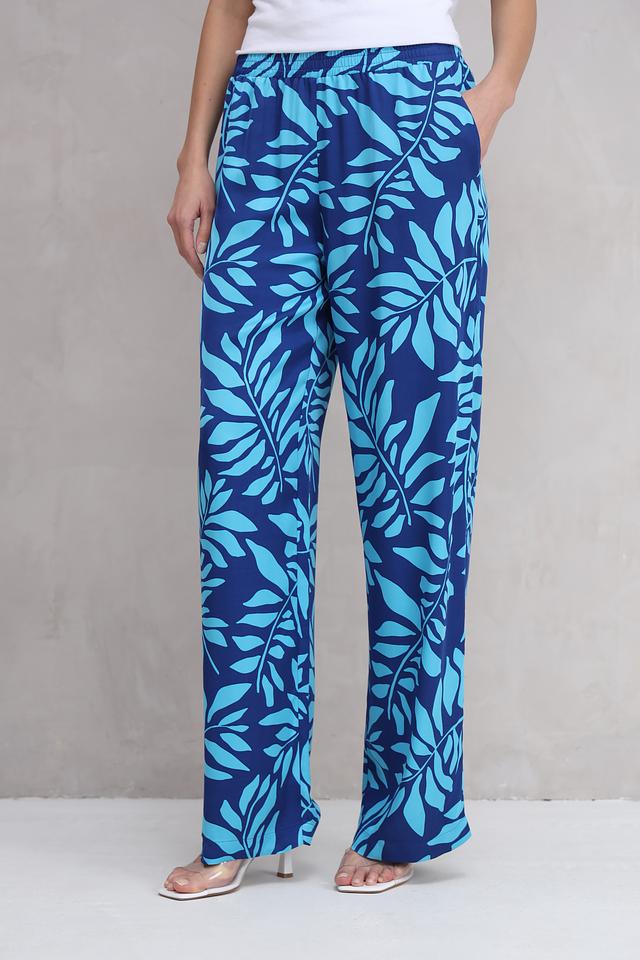 Яркий синий цвет в сочетании с оригинальным цветочным принтом привлекает внимание и подчеркивает индивидуальность. Прямой крой обеспечивает свободу движений, а эластичный пояс гарантирует комфортную посадку по фигуре.