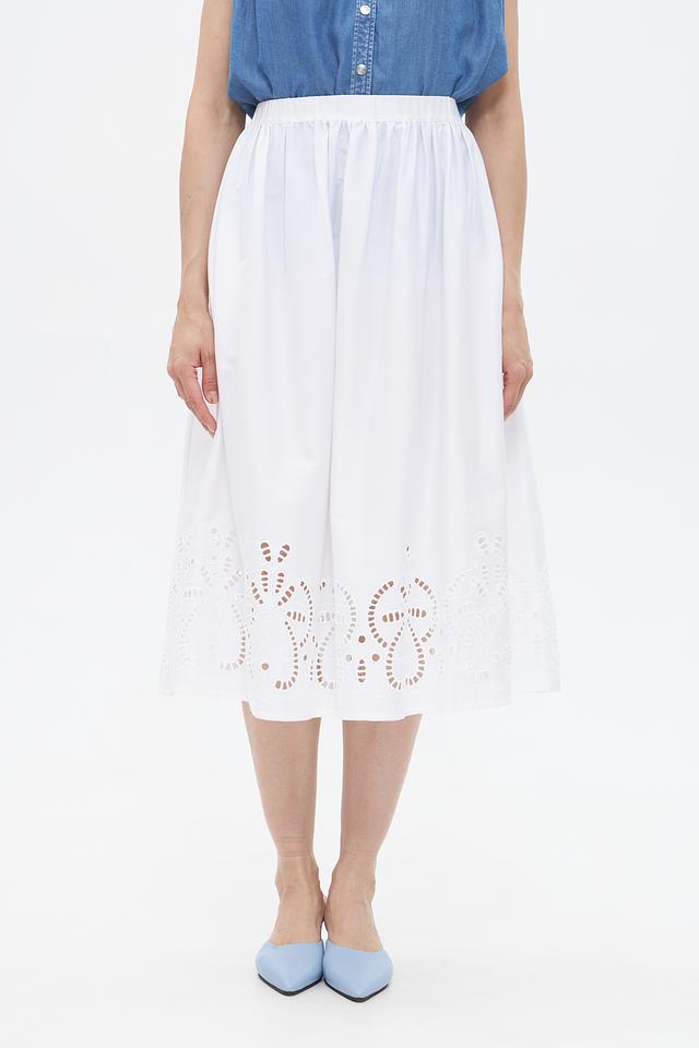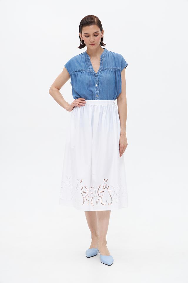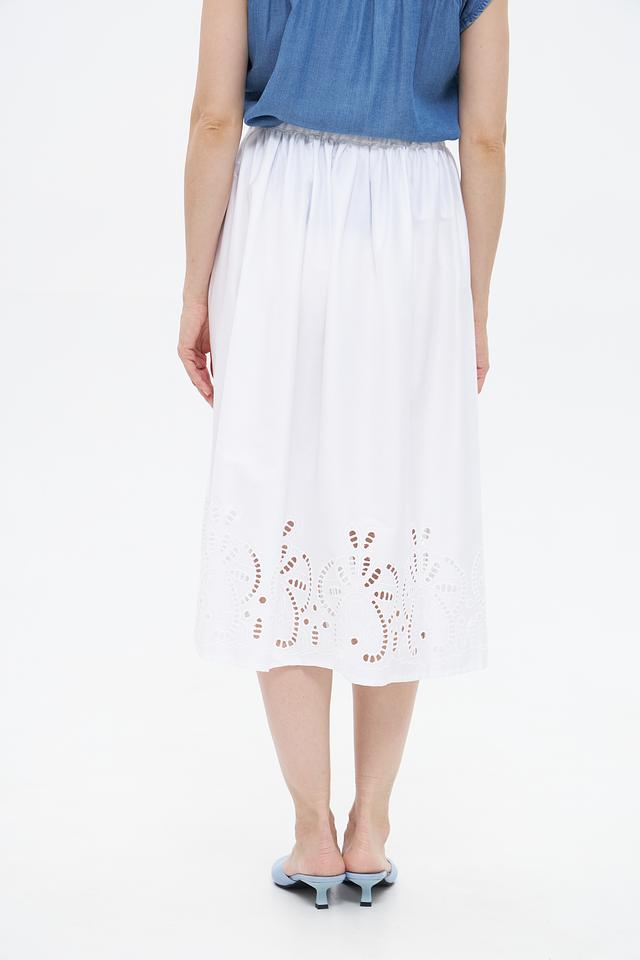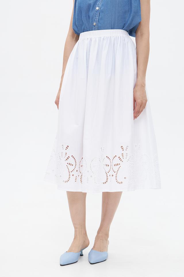 Основной цвет юбки – белый, что делает ее универсальной и легко сочетаемой с различными элементами одежды. Ажурная вышивка придает ей изысканность и оригинальность.
