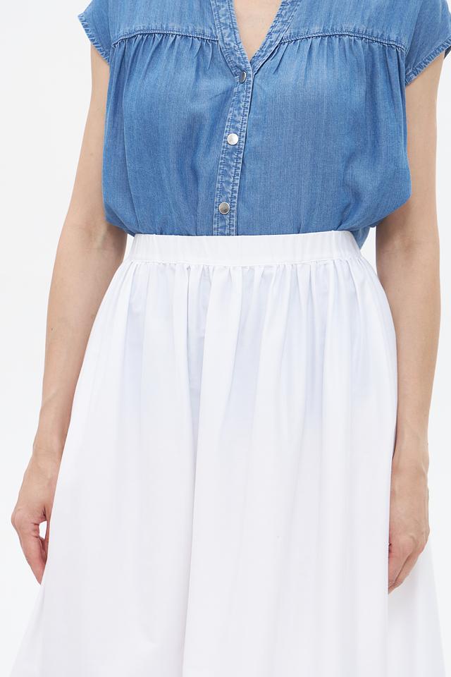 Юбка имеет завышенную талию и длину миди, что подчеркивает фигуру и создает элегантный силуэт. Она идеально подходит для создания как повседневных, так и более нарядных образов. Состав: хлопок 97%, эластан 3%.