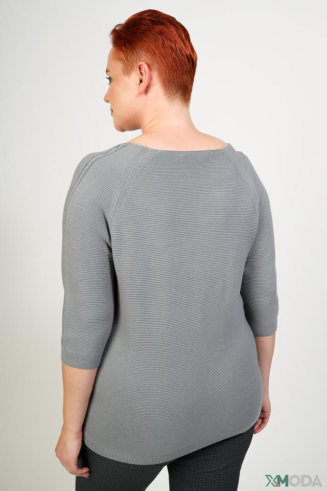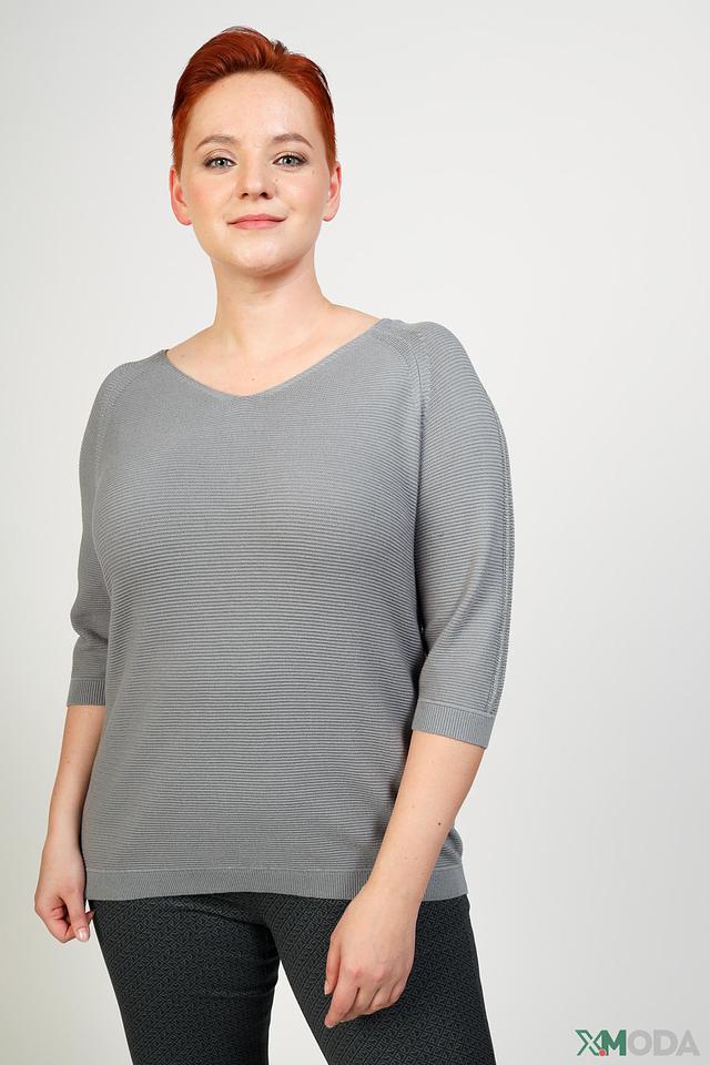 Пуловер имеет серый цвет с вертикальными полосками, что придает ему интересный визуальный эффект. V-образный вырез горловины и рукава три четверти делают его универсальным для различных стилей.