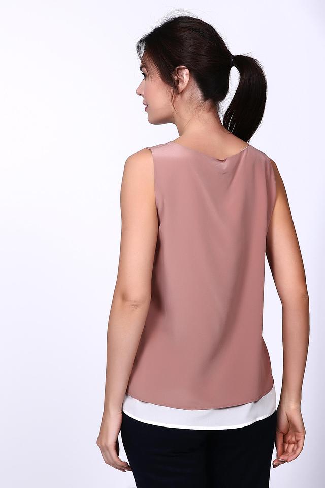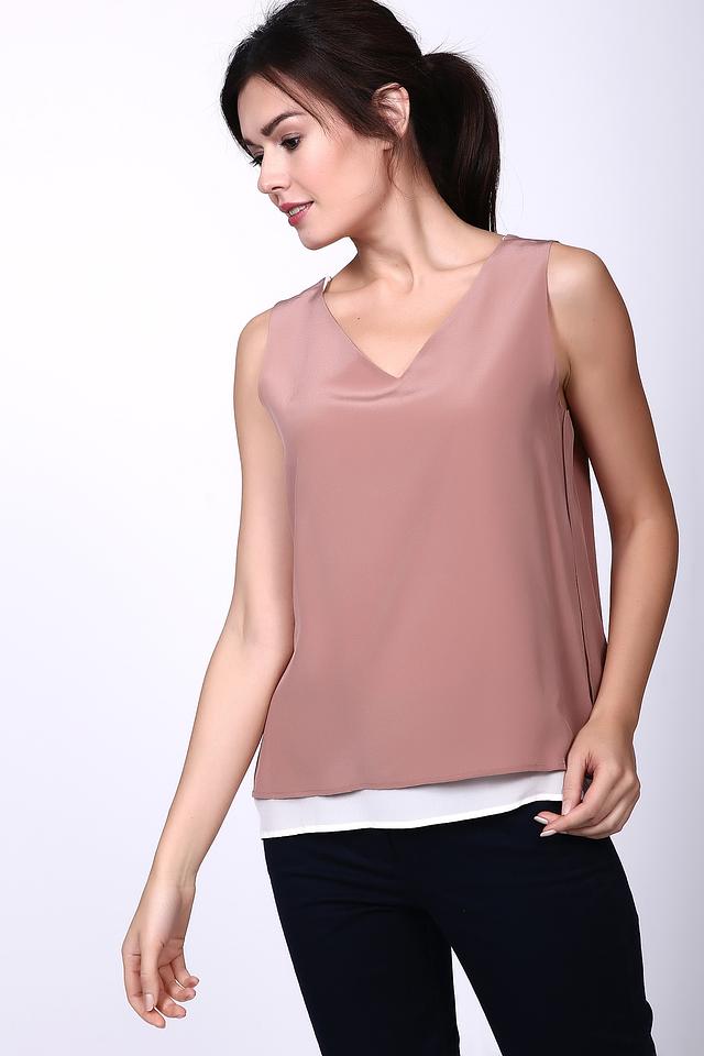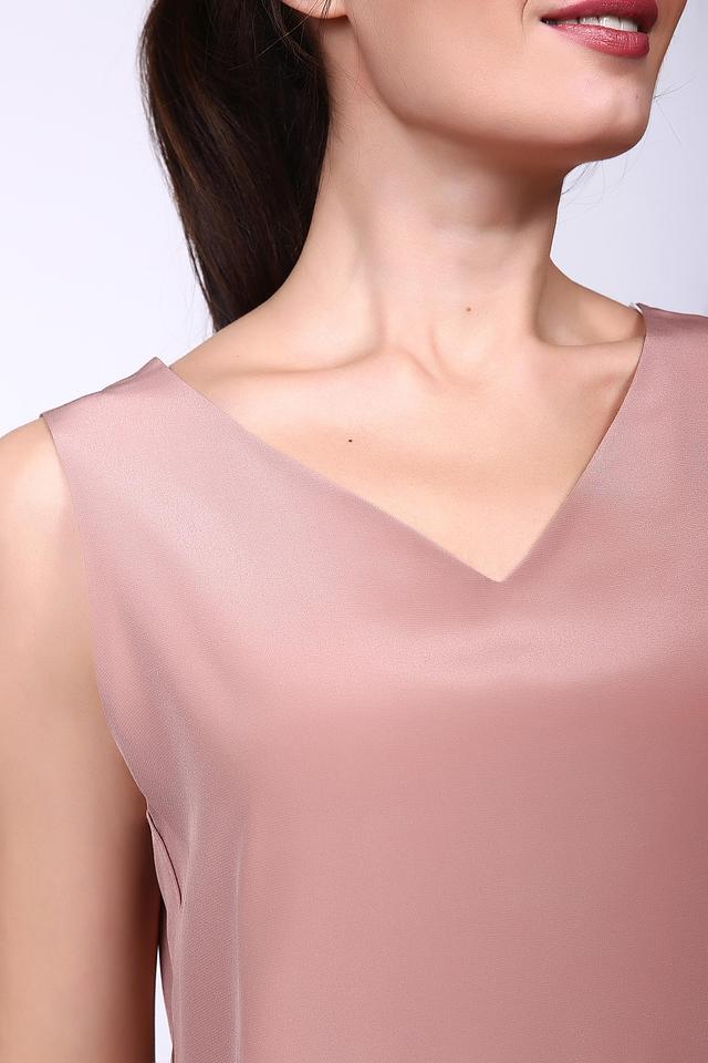 Топ имеет прямой крой и V-образный вырез, который визуально удлиняет шею и подчеркивает линию декольте. Отсутствие рукавов делает его идеальным выбором для теплой погоды или для создания многослойных образов.