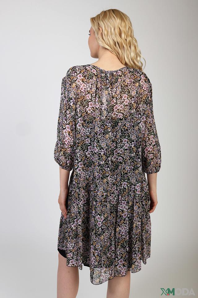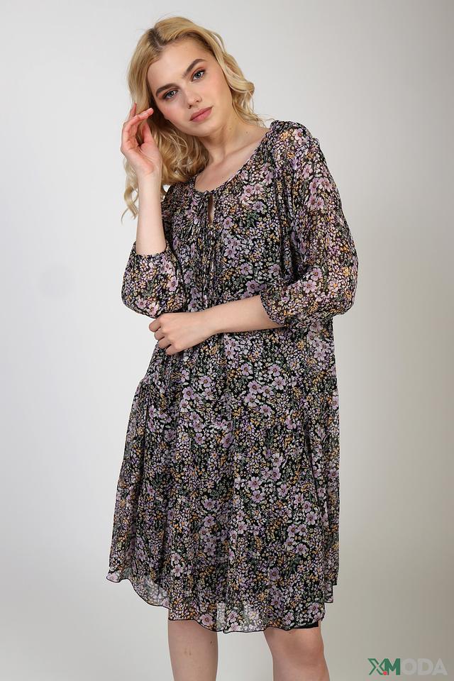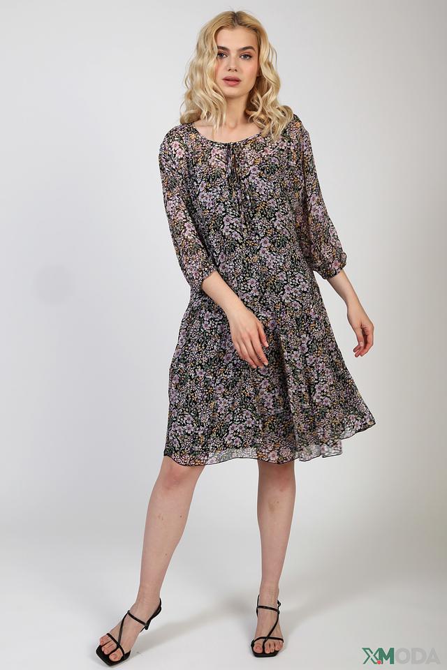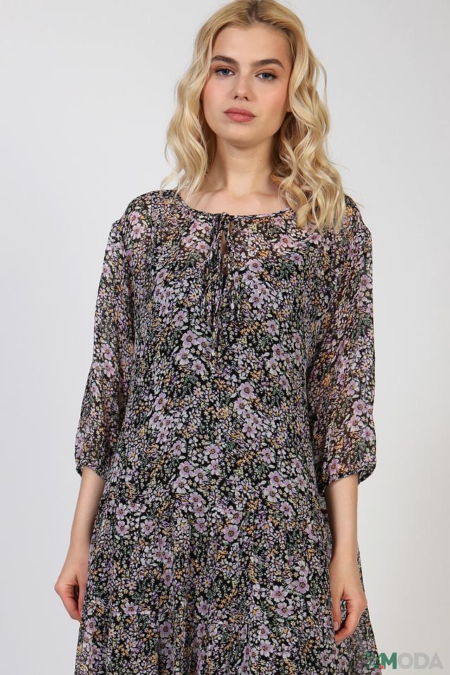 Платье имеет яркий цветочный принт на тёмном фоне, что делает его особенно привлекательным и женственным. Фасон платья – свободный, с завязками на горловине, что позволяет регулировать глубину выреза. Рукава – три четверти, слегка расклешенные к низу.