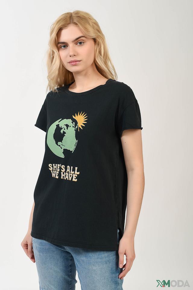 Эта футболка от бренда Set станет отличным дополнением к вашему повседневному образу. Она выполнена в классическом чёрном цвете и украшена ярким принтом в виде земного шара и надписью "She's all we have".
