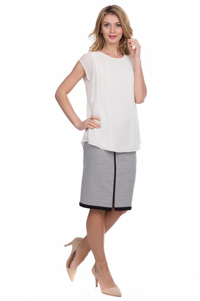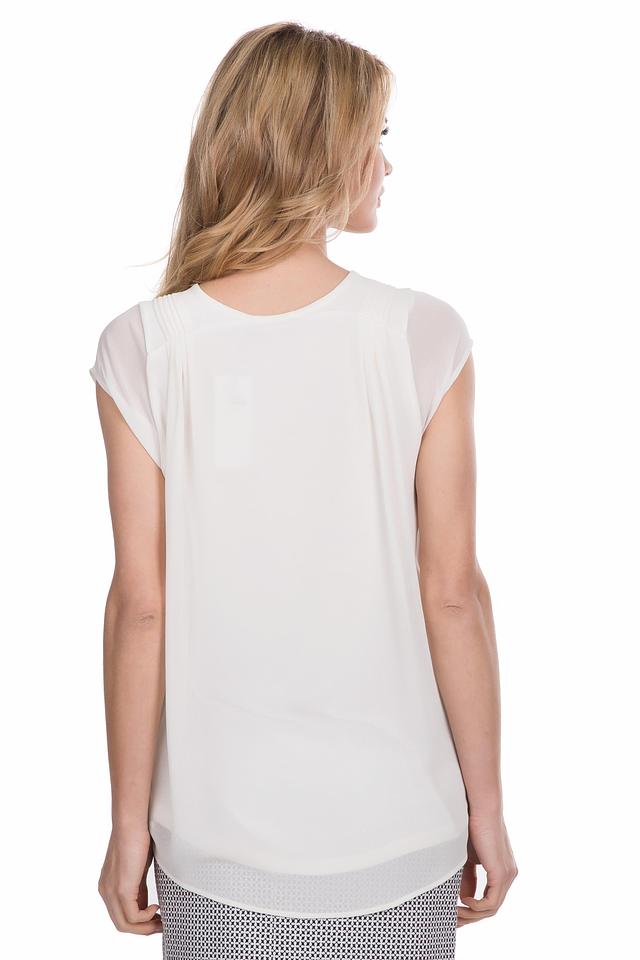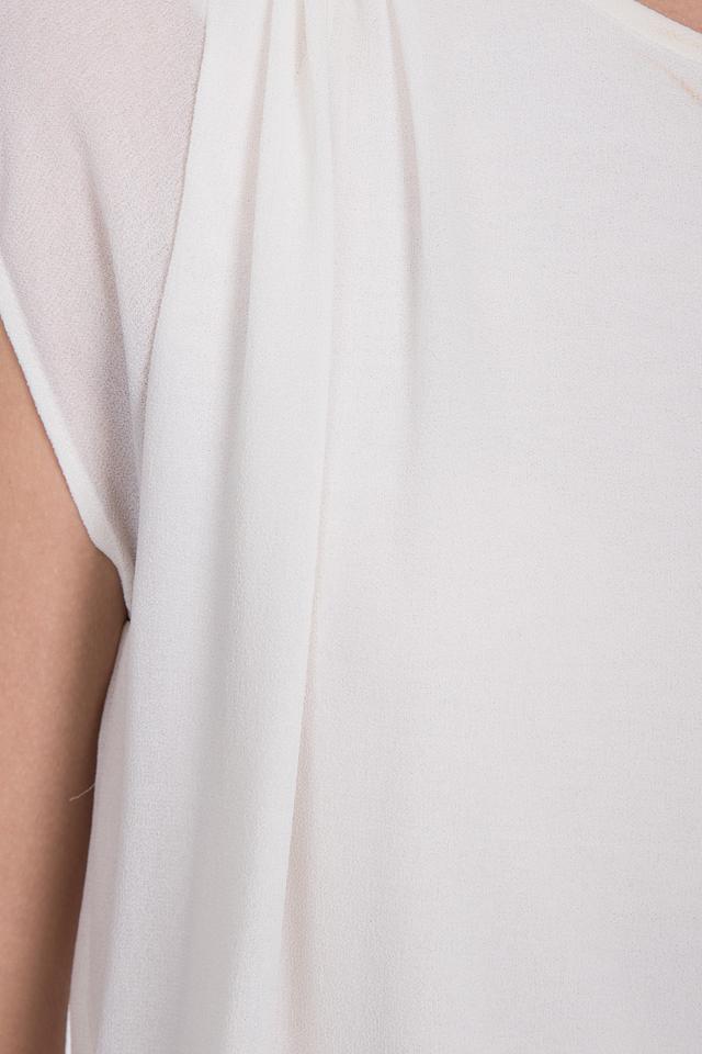 Блуза имеет свободный крой, который обеспечивает комфорт в носке. Короткие рукава-крылышки придают ей лёгкость и воздушность. Модель выполнена из 100% полиэстера, что делает её приятной на ощупь и простой в уходе.