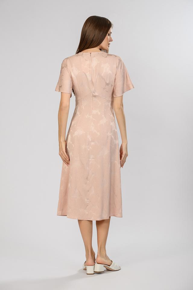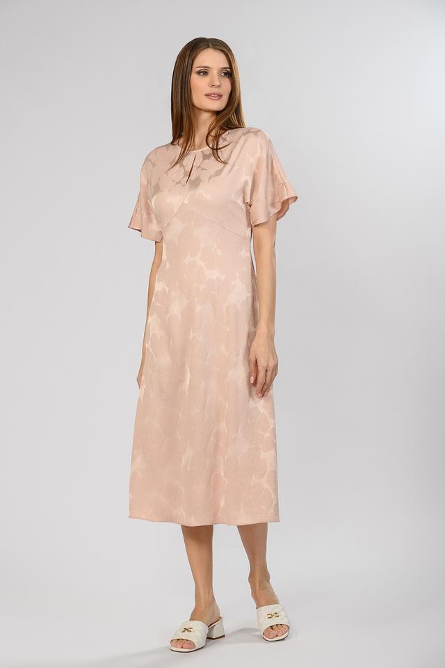 Платье имеет прямой силуэт, длину миди и короткие рукава. Вырез горловины выполнен в виде аккуратного V-образного разреза. Ткань платья – мягкая и приятная к телу вискоза с небольшим добавлением эластана, что обеспечивает комфортную посадку и лёгкость в уходе.