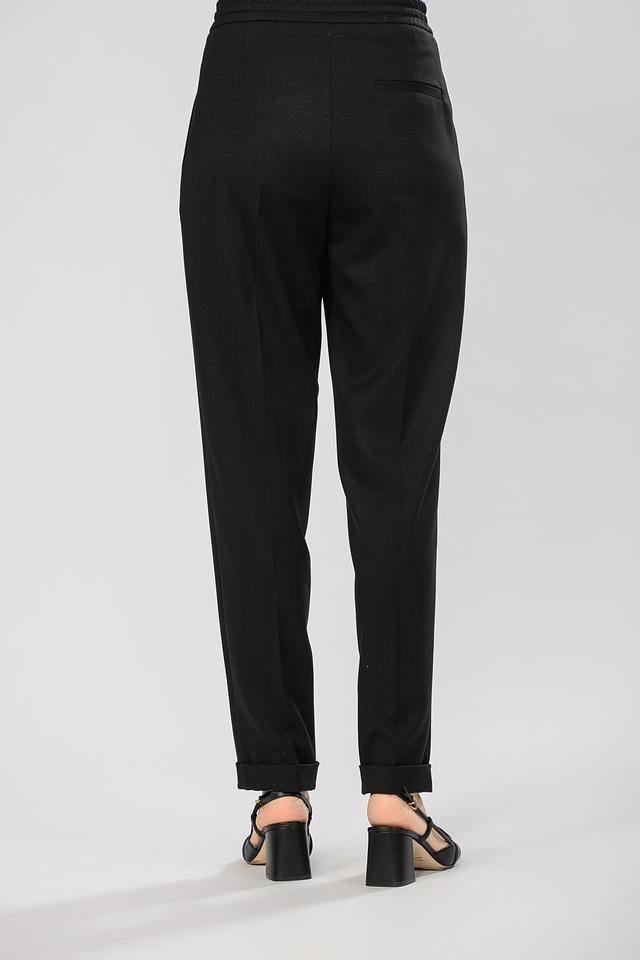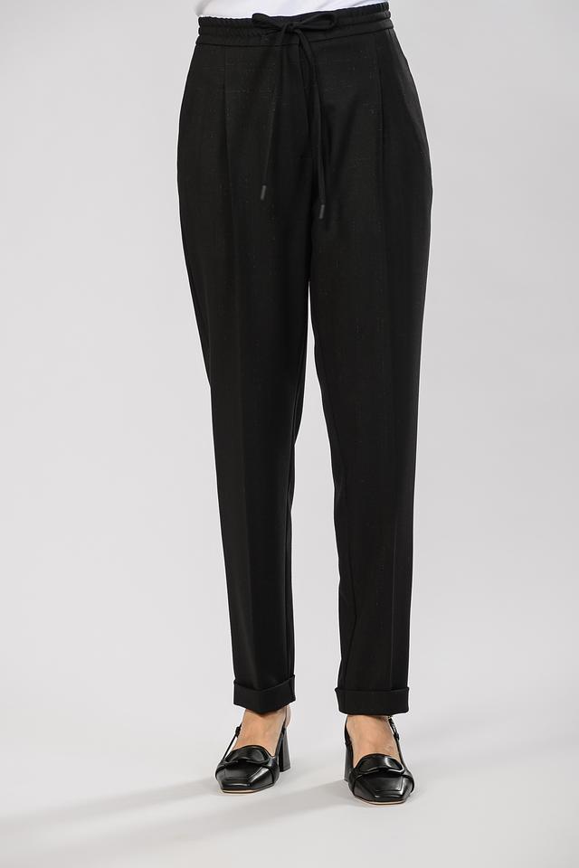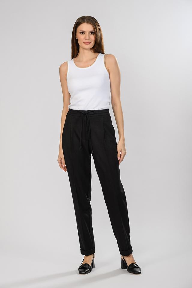 Брюки имеют прямой крой и зауженный книзу силуэт, что делает их универсальными для разных типов фигуры. Пояс на резинке обеспечивает комфортную посадку, а завязки позволяют регулировать облегание по талии. На брюках имеются складки, добавляющие им элегантности.
