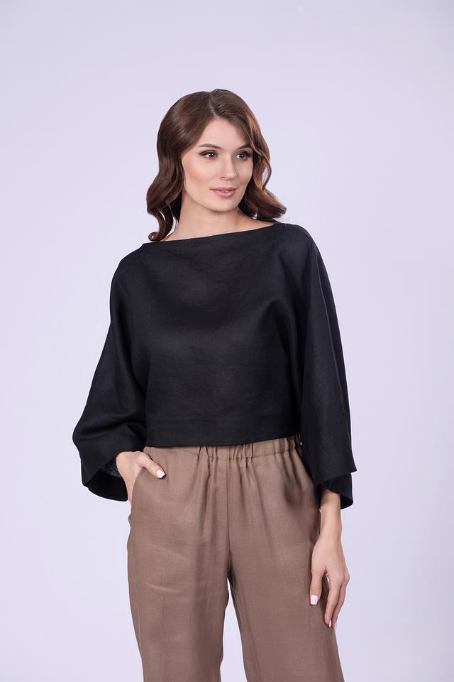 Чёрная блуза от Shade из 100% льна — это стильное и комфортное решение для создания лёгкого и воздушного образа. Модель имеет свободный крой и оригинальные рукава-крылья, которые придают ей особый шарм. Состав: лен 100%