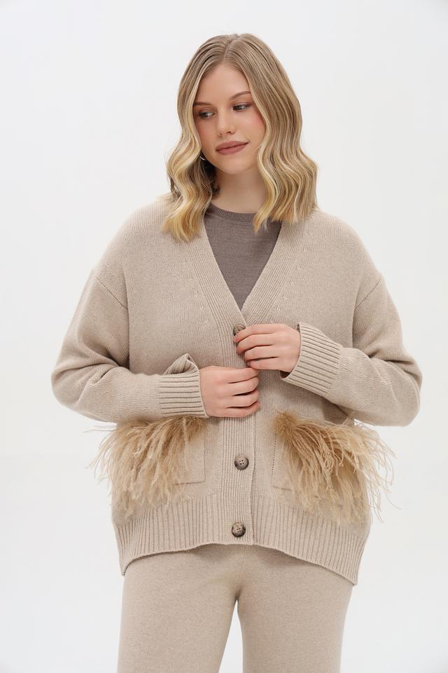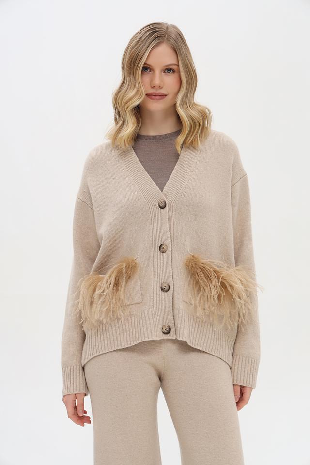 Дизайн кардигана отличается оригинальностью благодаря декоративной бахроме, расположенной на карманах. V-образный вырез и свободный крой создают расслабленный и непринужденный образ. Застежка на пуговицы позволяет регулировать степень открытости.