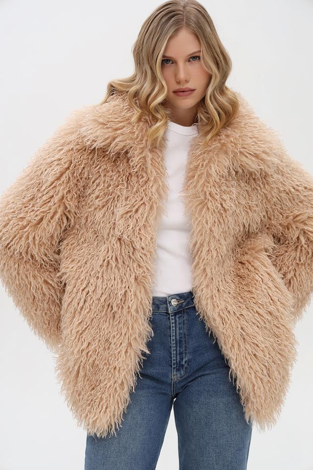 Куртка имеет свободный крой, который не сковывает движения и позволяет создавать многослойные образы. Длинный ворс придает изделию роскошный вид и приятные тактильные ощущения. Отсутствие застежек делает куртку легкой и удобной в носке.