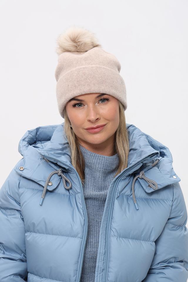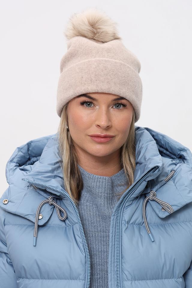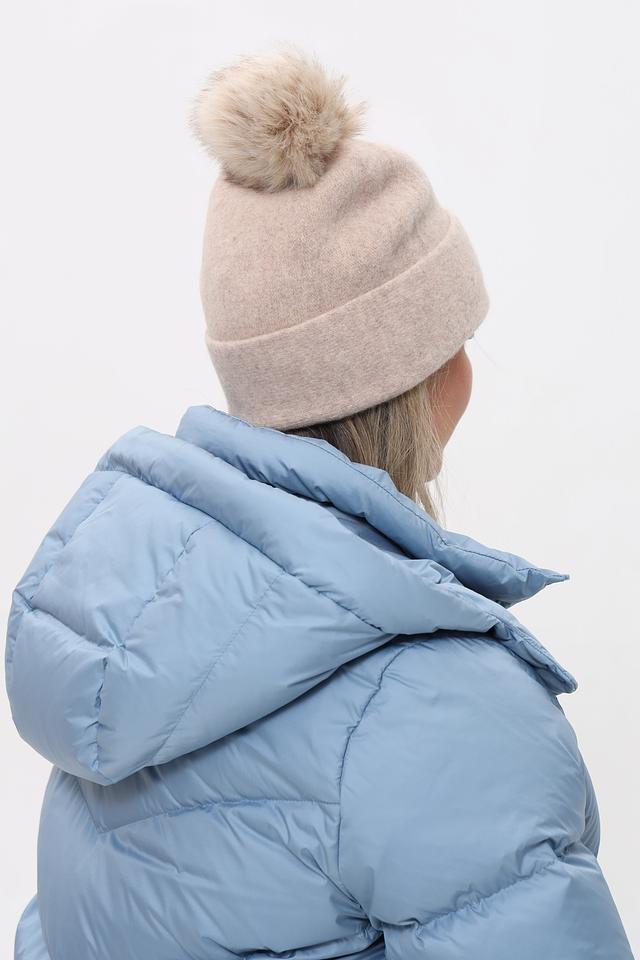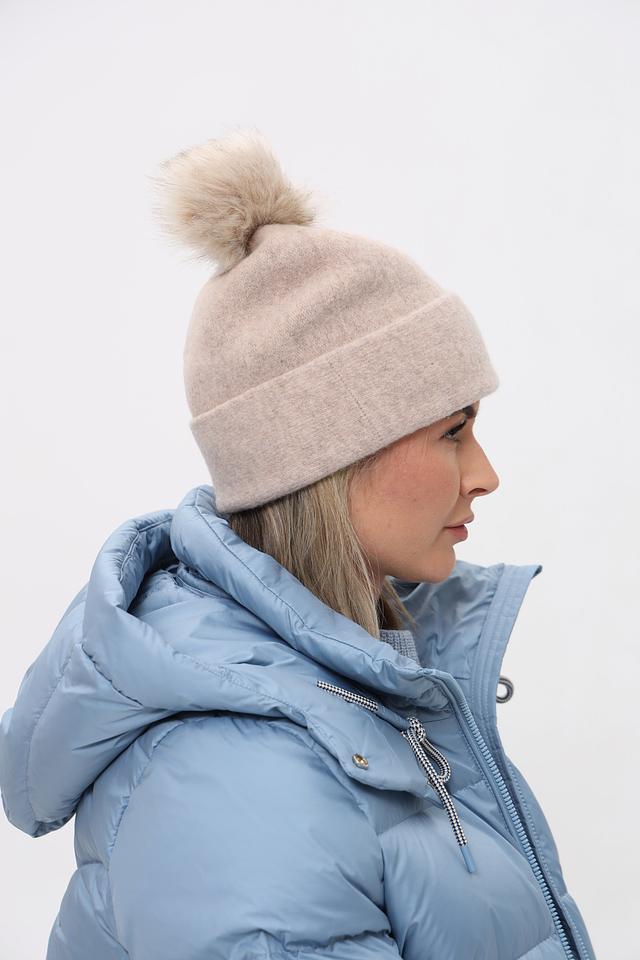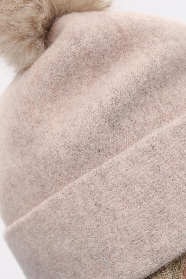 Шапка имеет классический дизайн с мягким помпоном, который добавляет ей очарования и оригинальности. Бежевый цвет шапки универсален и легко сочетается с различными вариантами верхней одежды.