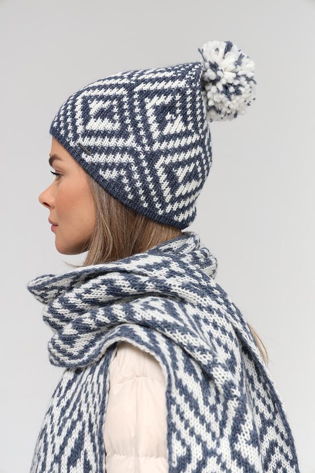 Стильная шапка Marhatter синего цвета с белым геометрическим узором и помпоном. Изготовлена из шерсти, акрила и альпаки для тепла и комфорта. Состав: шерсть 47%, акрил 45%, альпака 8%
