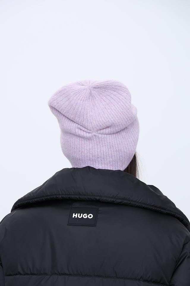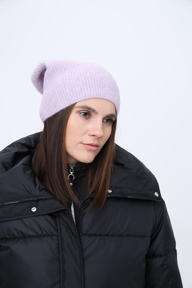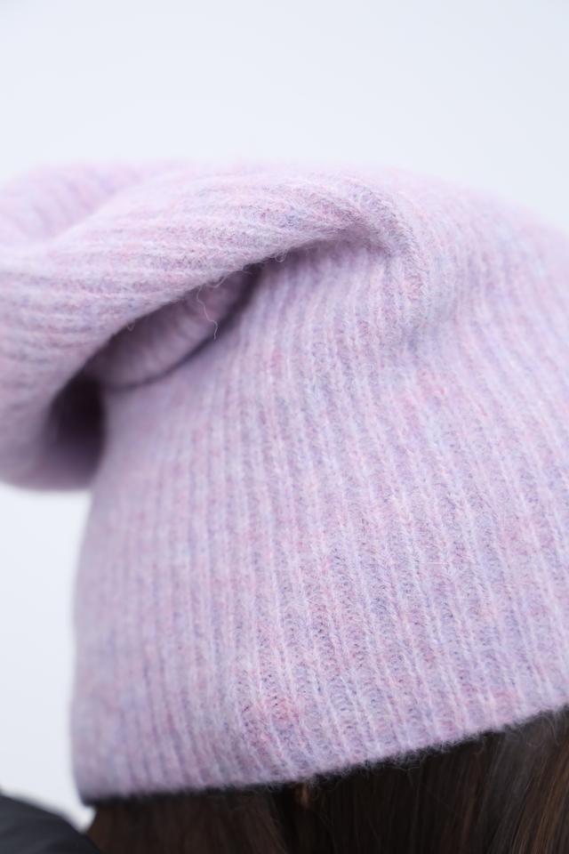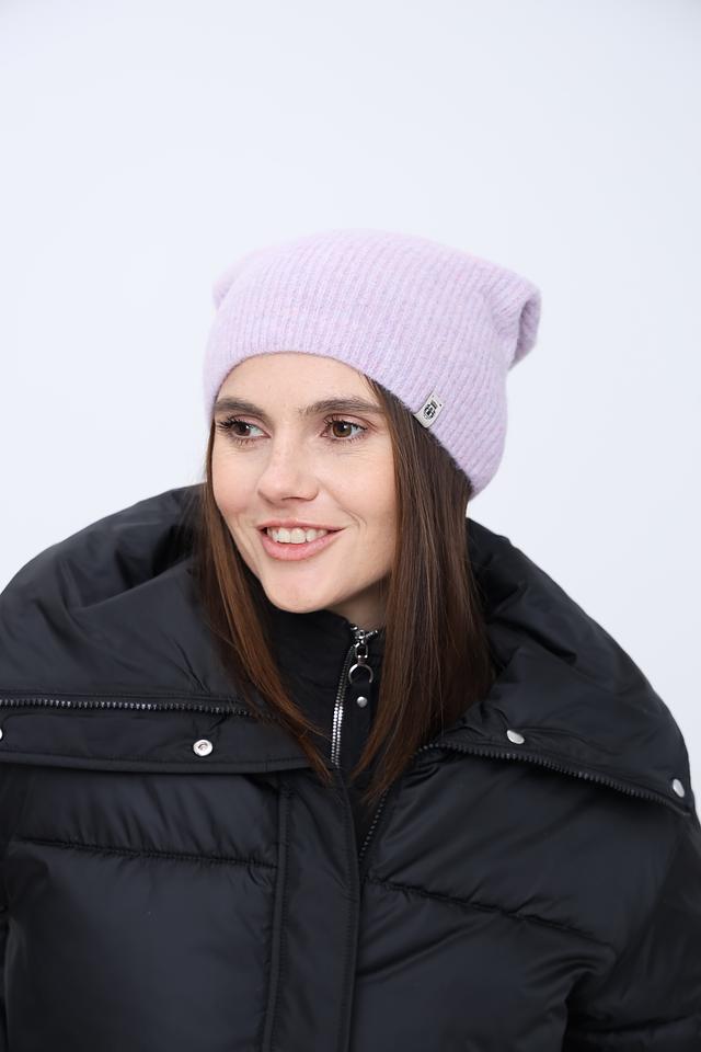 Нежный лавандовый цвет шапки легко сочетается с различными оттенками одежды, добавляя образу свежести и женственности. Вязаная текстура придает шапке объем и уютный вид. На боковой стороне шапки расположен небольшой логотип бренда.