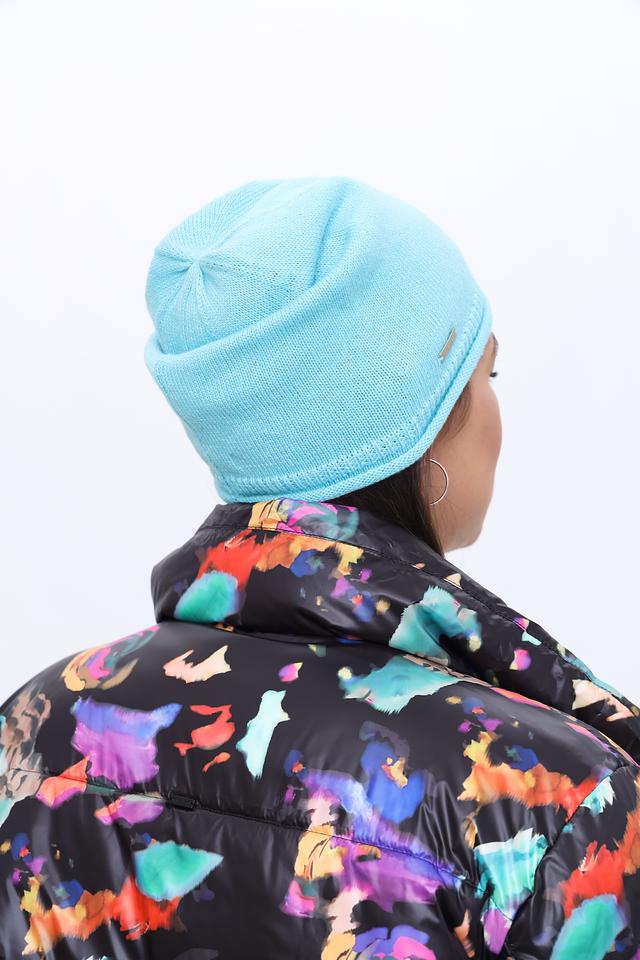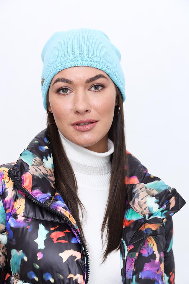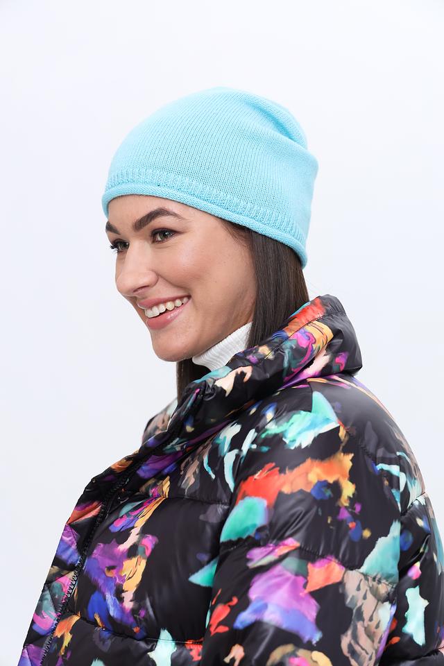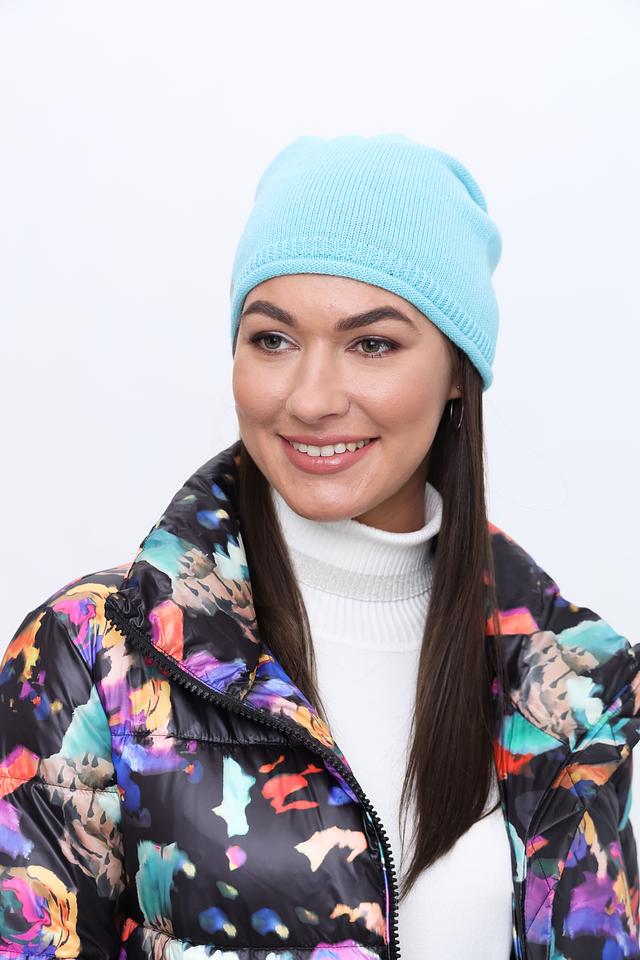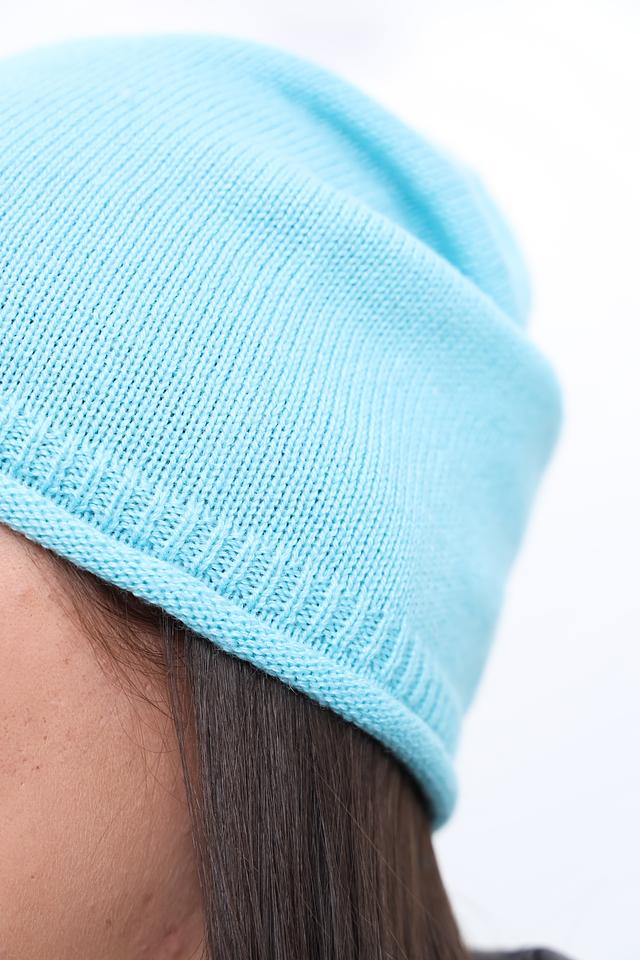 Шапка имеет классическую форму и однотонный голубой цвет. Мягкий трикотажный материал приятен к коже и хорошо сохраняет форму. Небольшой декоративный элемент сбоку добавляет шапке изысканности.