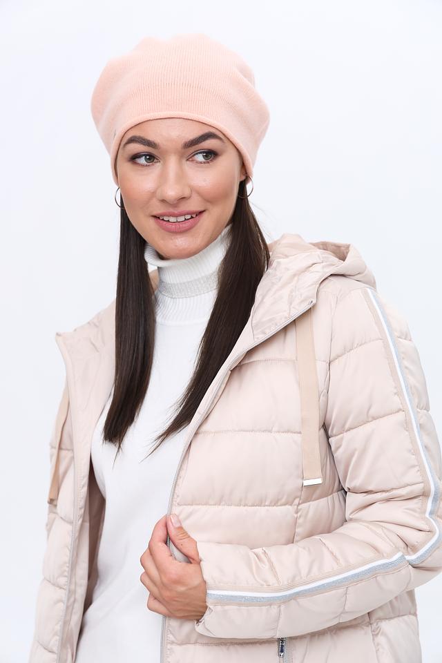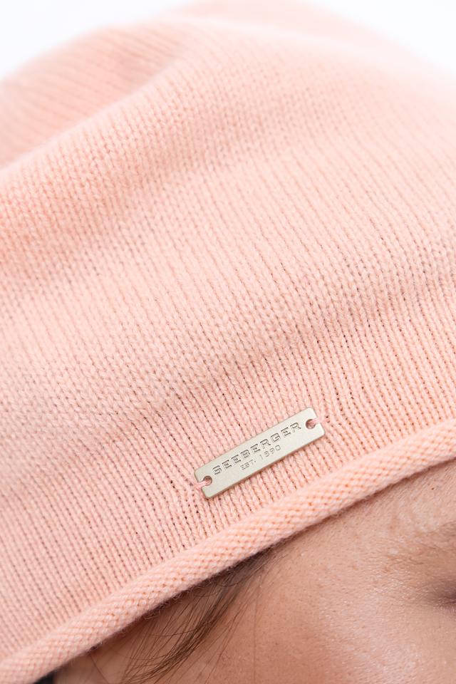Шапка имеет классическую форму и нежно-розовый цвет, который легко сочетается с различными оттенками в вашем гардеробе. Минималистичный дизайн дополнен небольшим металлическим логотипом бренда, который придает шапке элегантный вид.