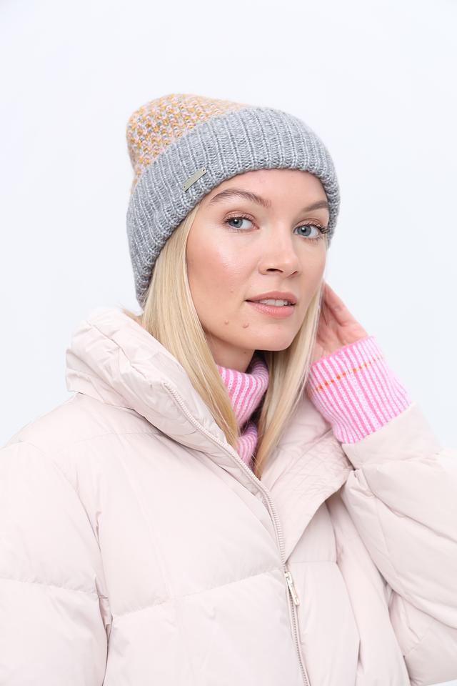 Дизайн шапки сочетает в себе серый и горчичный цвета, создавая интересный и современный образ. Вязаная текстура придает шапке уютный вид. Шапка плотно прилегает к голове, защищая от холода и ветра.