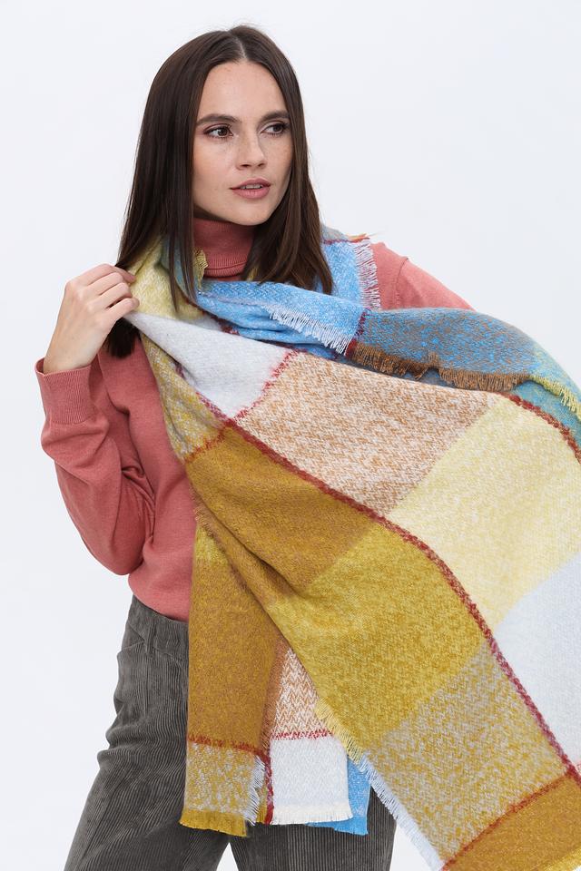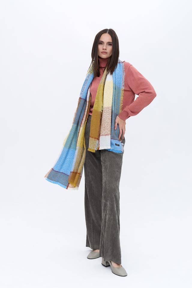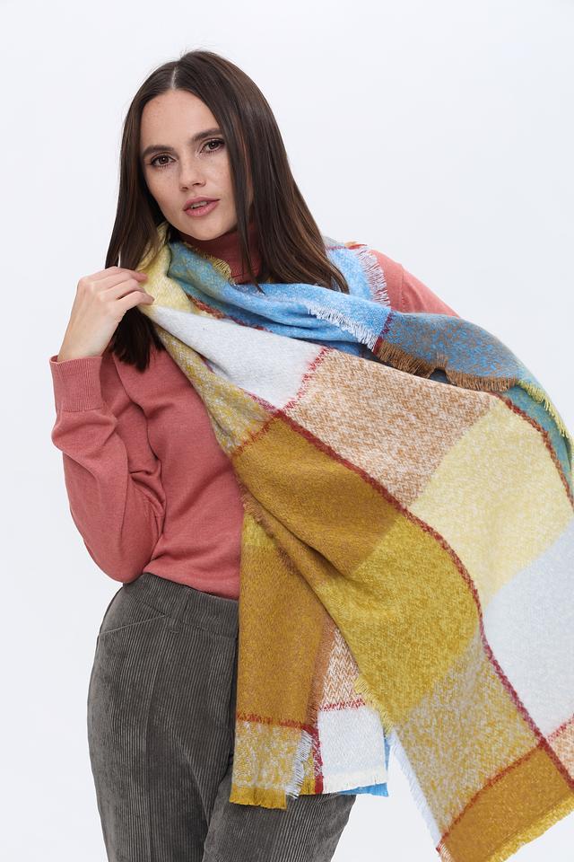 Этот шарф от Fraas станет ярким акцентом в вашем гардеробе. Он выполнен в классической клетке, сочетающей в себе голубой, жёлтый и бежевый цвета.