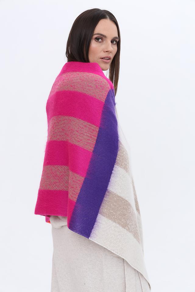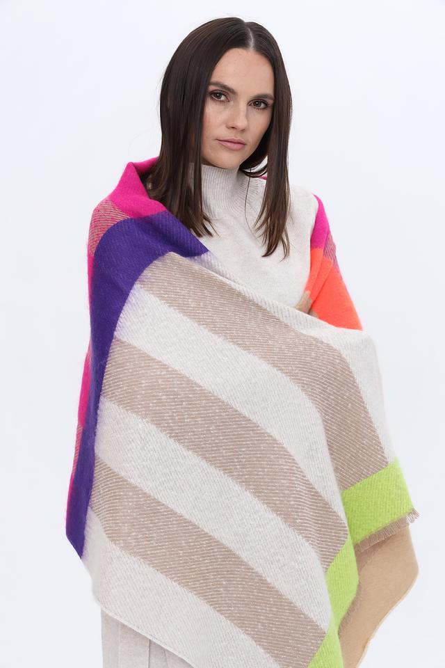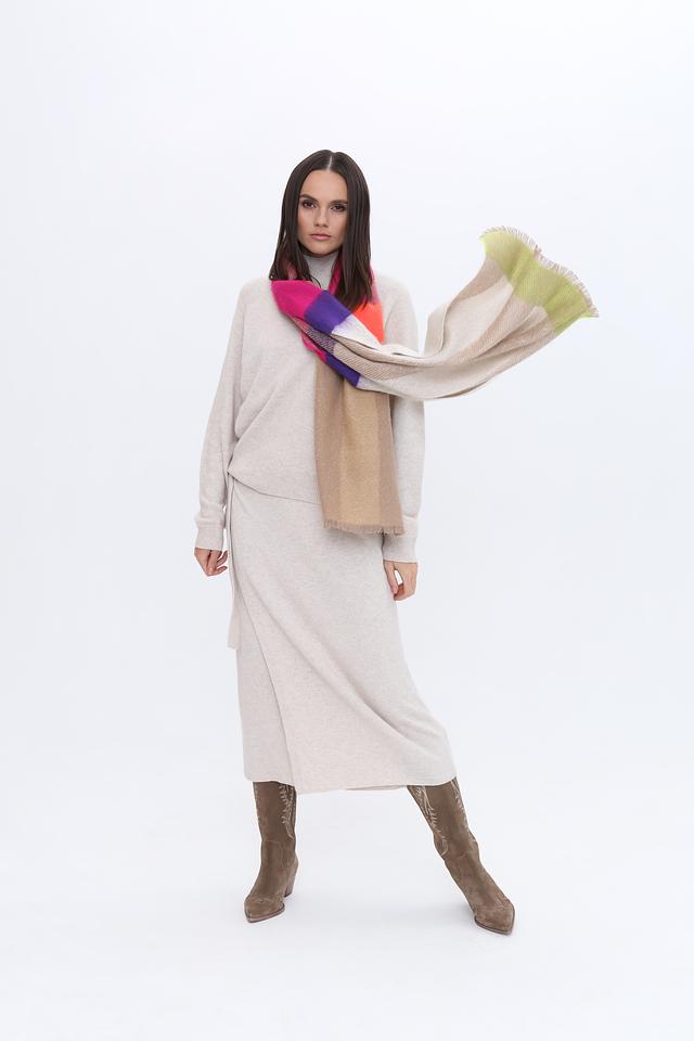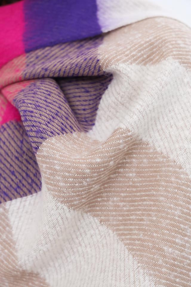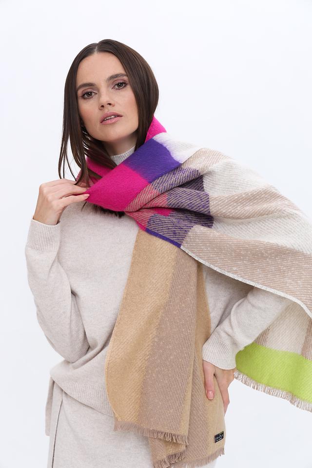 Дизайн шарфа выполнен в яркой клетке, сочетающей в себе различные оттенки: розовый, фиолетовый, бежевый, оранжевый и зелёный. Такое сочетание цветов делает его универсальным аксессуаром, который легко сочетается с различными предметами гардероба.