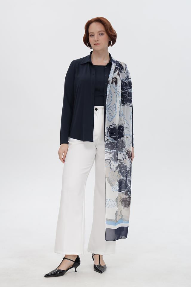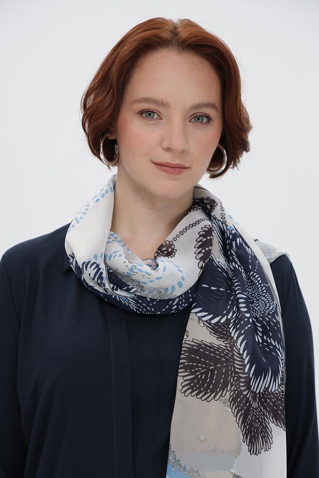 Основой изделия послужил 100% полиэстер, что обеспечивает легкость, мягкость и практичность в носке. Шарф имеет прямоугольную форму и достаточную длину, позволяющую экспериментировать с различными способами драпировки.