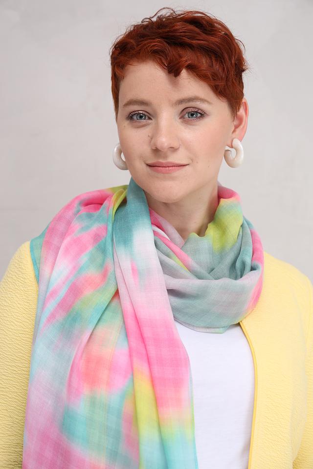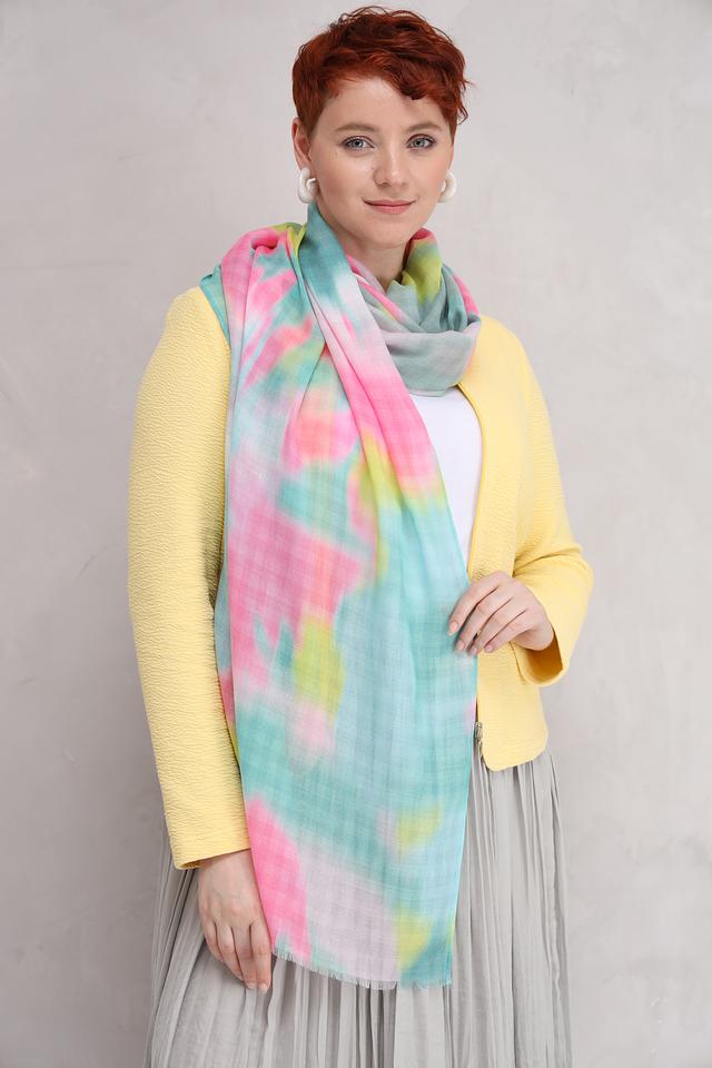 Особенностью данного шарфа является его уникальный дизайн, выполненный в технике тай-дай. Яркие и насыщенные цвета гармонично сочетаются друг с другом, создавая неповторимый узор.