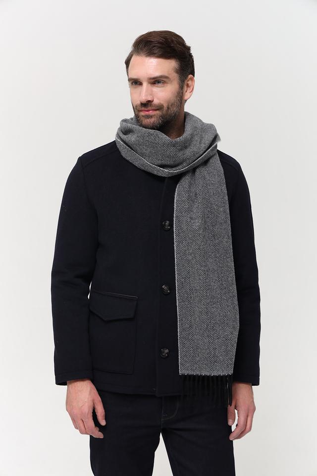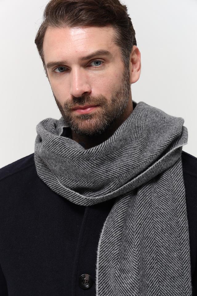 Шарф имеет классический дизайн с узором "клетка", выполненным в сочетании серых оттенков. Аккуратная бахрома по краям добавляет шарфу завершенности и изысканности.