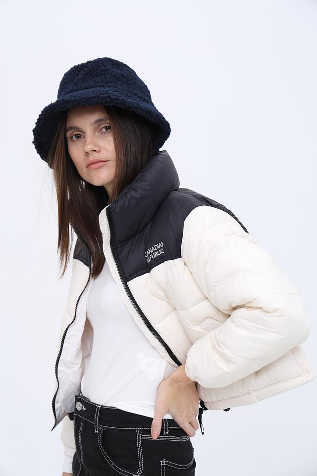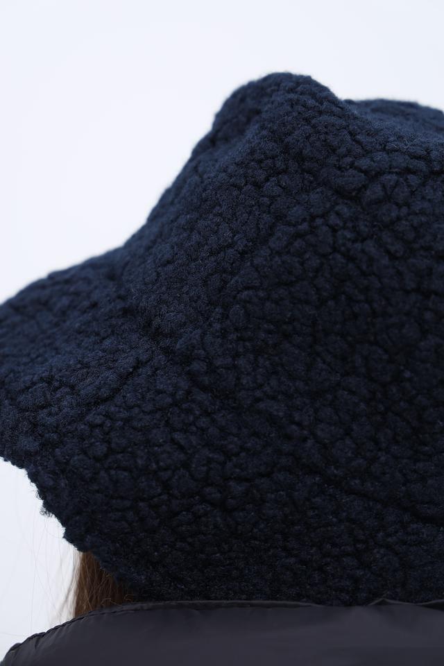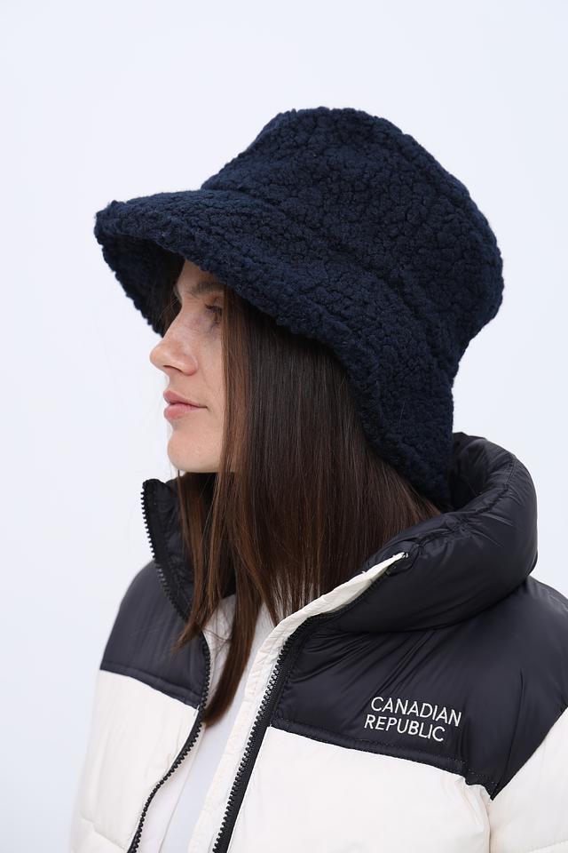Шляпа имеет форму бакета с небольшими полями, которые обеспечивают защиту от солнца и ветра. Тёмно-синий цвет и фактурная отделка из искусственного меха придают ей особый шарм.