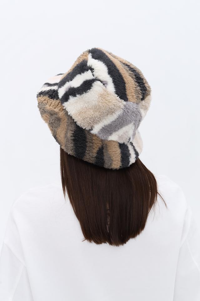 Шляпа выполнена в форме бакета и декорирована искусственным мехом с принтом, имитирующим леопардовую расцветку. Сочетание коричневых, бежевых и белых оттенков делает эту модель универсальной и подходящей к различным стилям одежды.