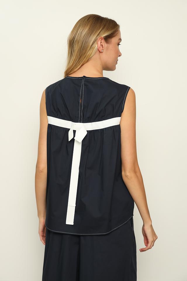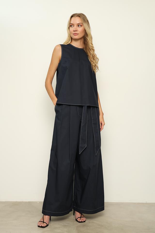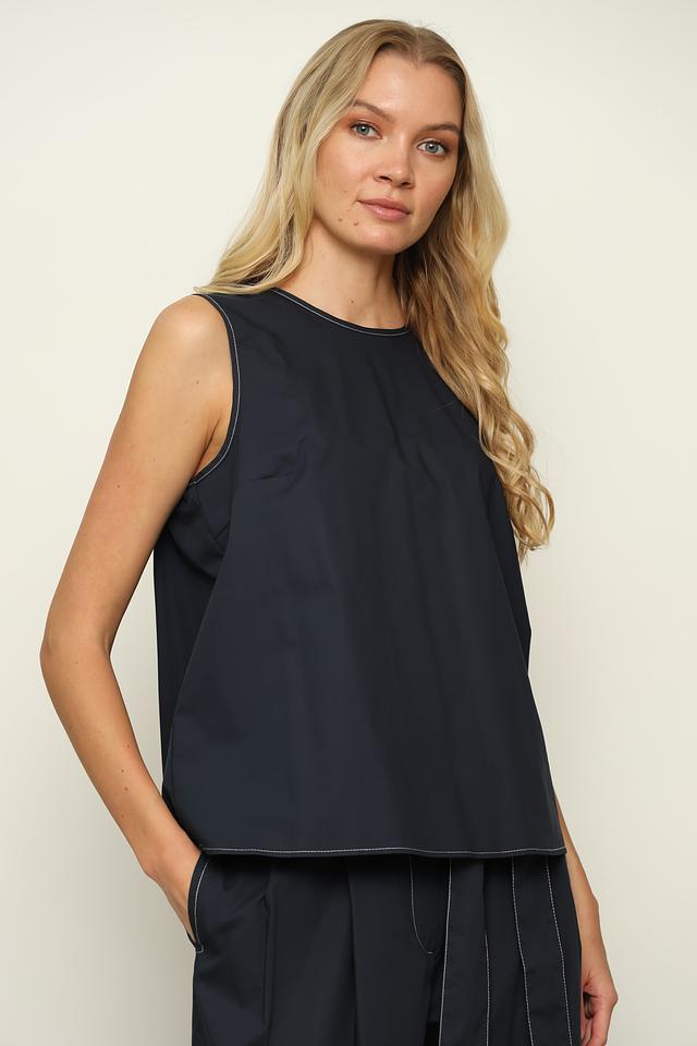 Топ имеет свободный крой и округлый вырез горловины, что обеспечивает комфортную посадку по фигуре. Отсутствие рукавов делает его идеальным выбором для тёплой погоды. Аккуратная отделка швов белой нитью добавляет изысканности и оригинальности.