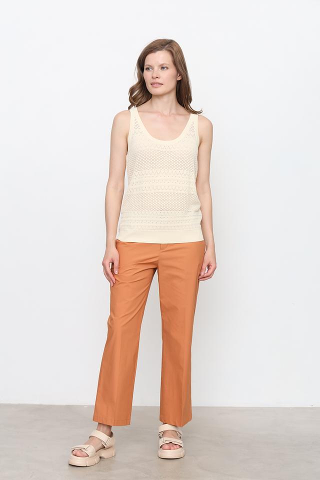 Топ имеет классический круглый вырез горловины и широкие бретели. Особое внимание привлекает ажурная вязка, которая придает изделию легкость и женственность. Благодаря своему лаконичному дизайну, этот топ легко сочетается с различными предметами одежды – от джинсов и шорт до юбок и брюк.