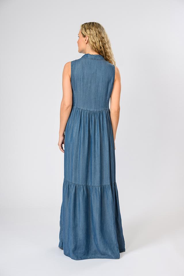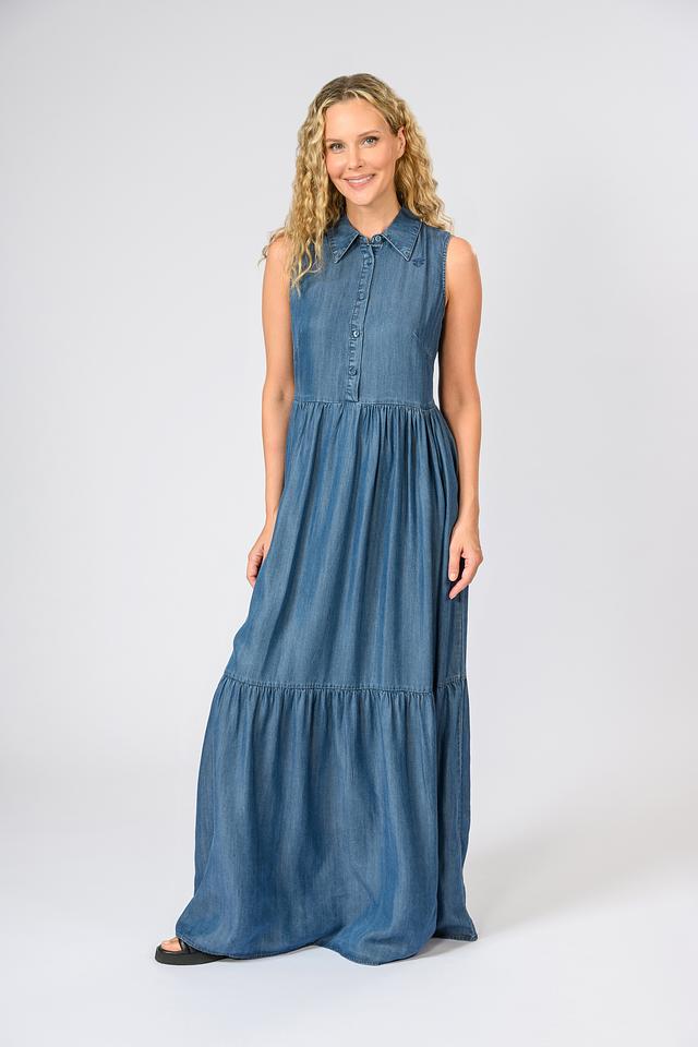 Модель отличается воротником рубашечного типа и застежкой на пуговицы по всей длине переда. Многослойная юбка придает платью лёгкость и воздушность. Платье не имеет рукавов, что делает его идеальным выбором для теплой погоды.