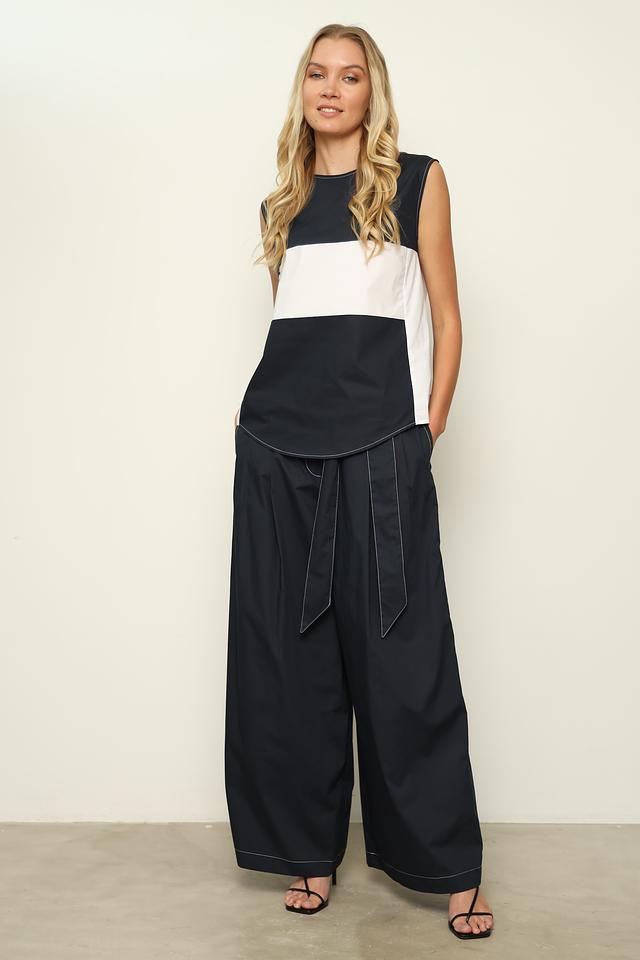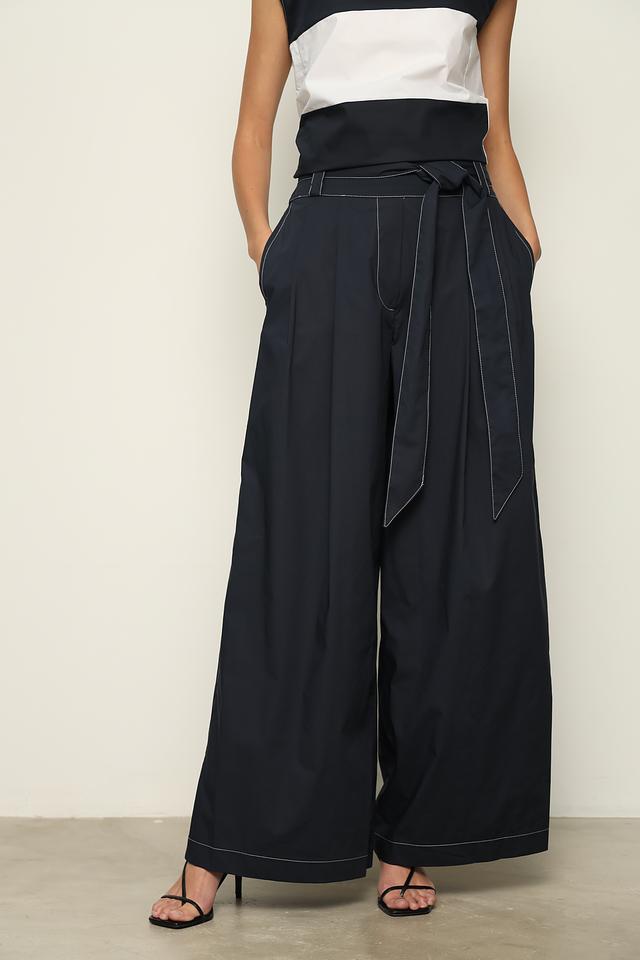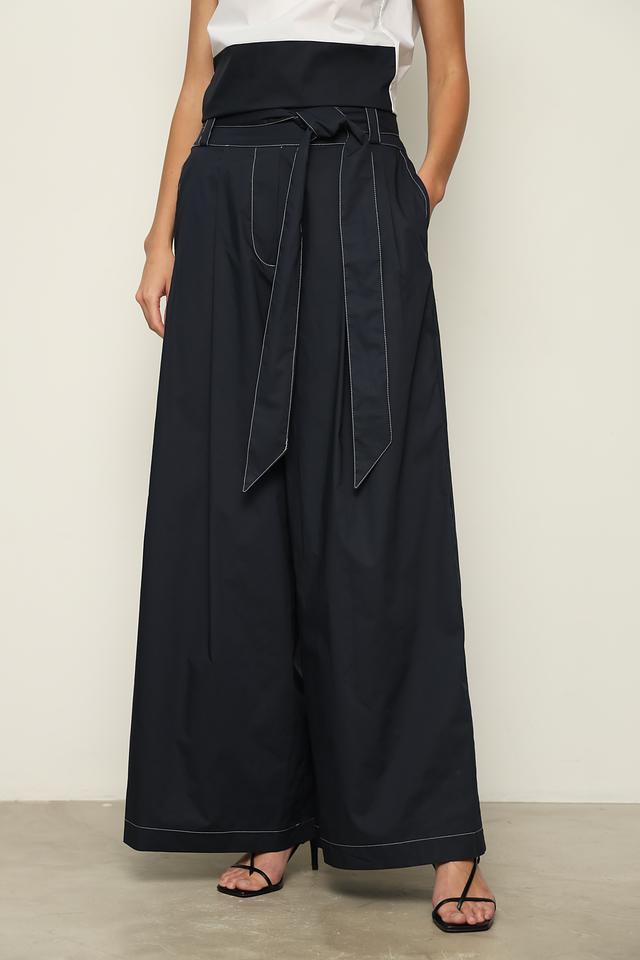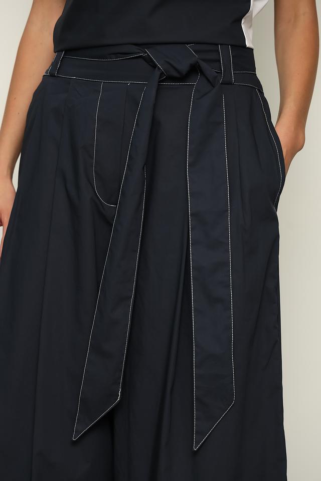 Брюки имеют завышенную талию и широкий пояс с завязками, которые подчеркивают фигуру и позволяют регулировать посадку. Прямой крой и широкие штанины обеспечивают свободу движений и создают эффектный силуэт. Декоративная отделка в виде контрастной строчки по карманам и по низу брюк добавляет изысканности и оригинальности.