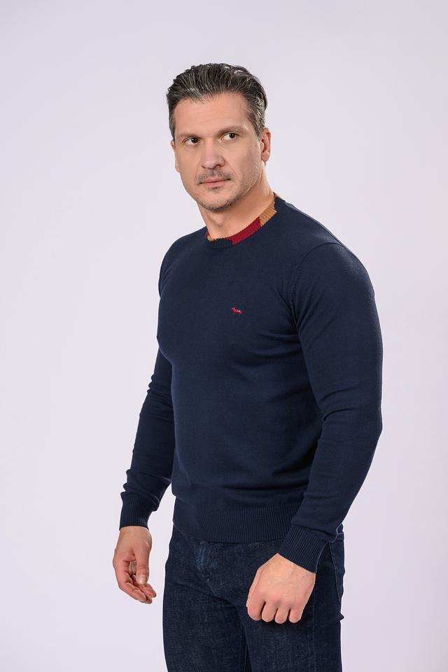 Мужской джемпер Harmont & Blaine тёмно-синего цвета с круглым вырезом и контрастной горловиной. Изготовлен из высококачественного хлопка с добавлением шерсти для мягкости и тепла. Отличается стильным дизайном и удобной посадкой. Состав: хлопок 60%, шерсть 40%