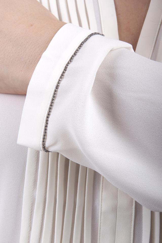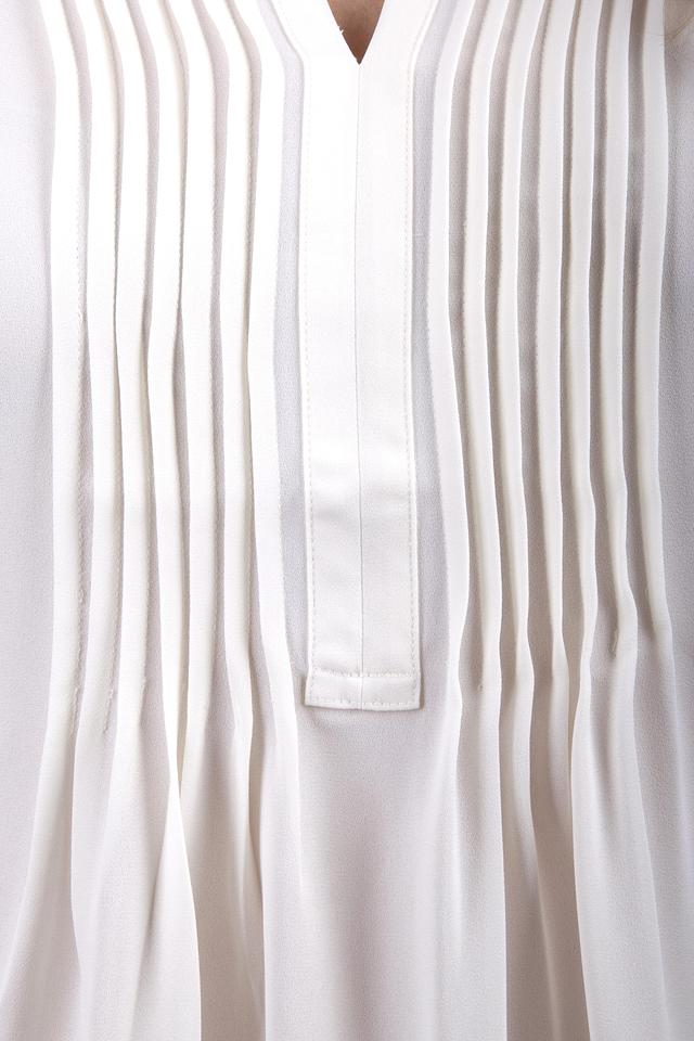 Модель имеет V-образный вырез, который подчеркивает женственность, и деликатную плиссировку на груди и рукавах, придающую ей изысканность. Длинные рукава и свободный крой обеспечивают комфорт в носке.