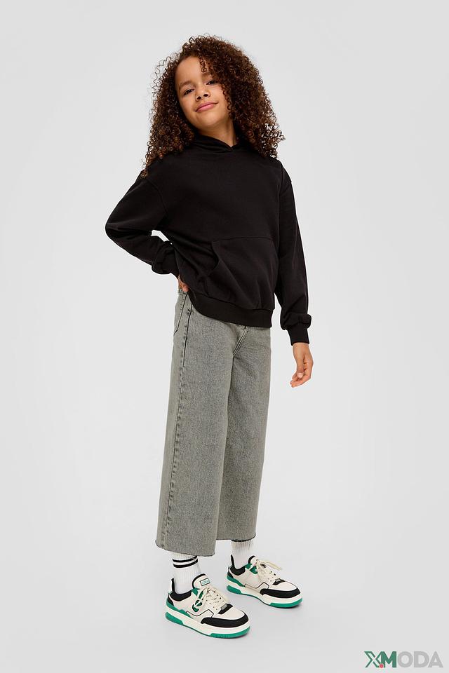 Джинсы имеют серый цвет с эффектом потертости, что придает им стильный и современный вид. Пояс на резинке обеспечивает удобную посадку, а широкие штанины-кюлоты – свободу движений.