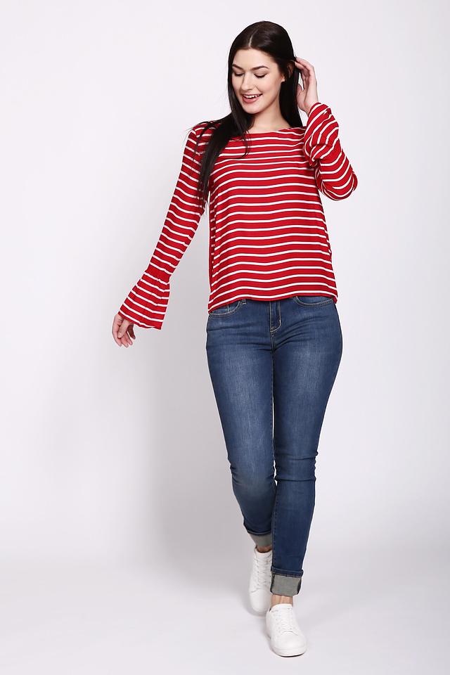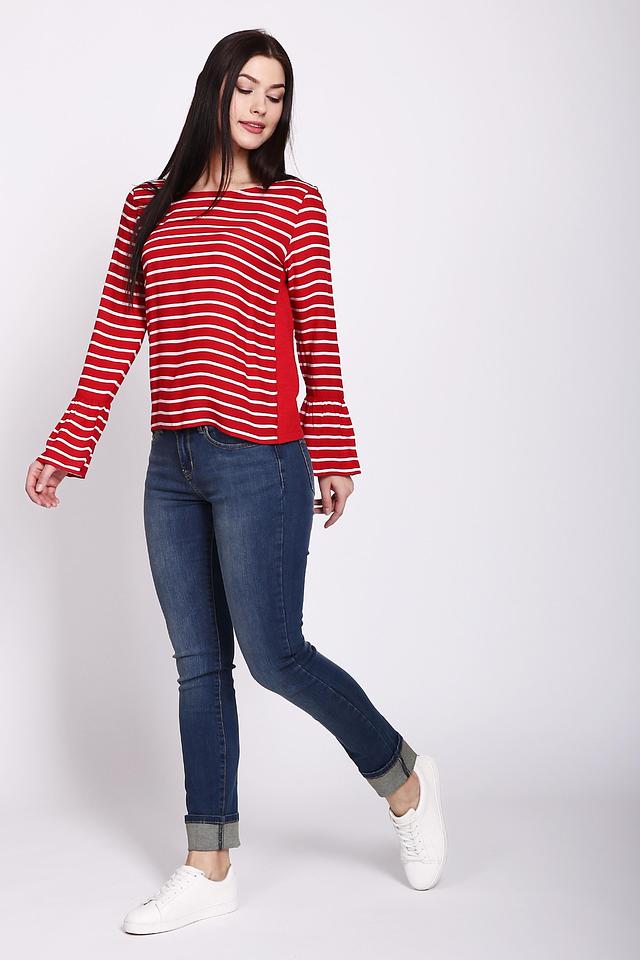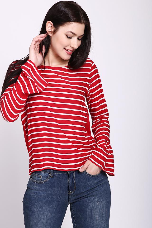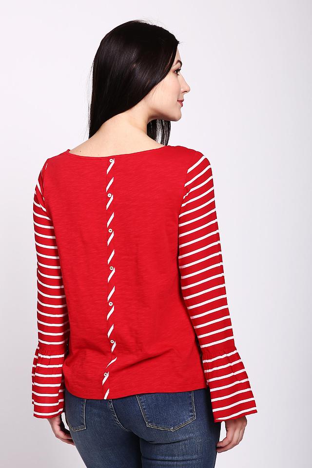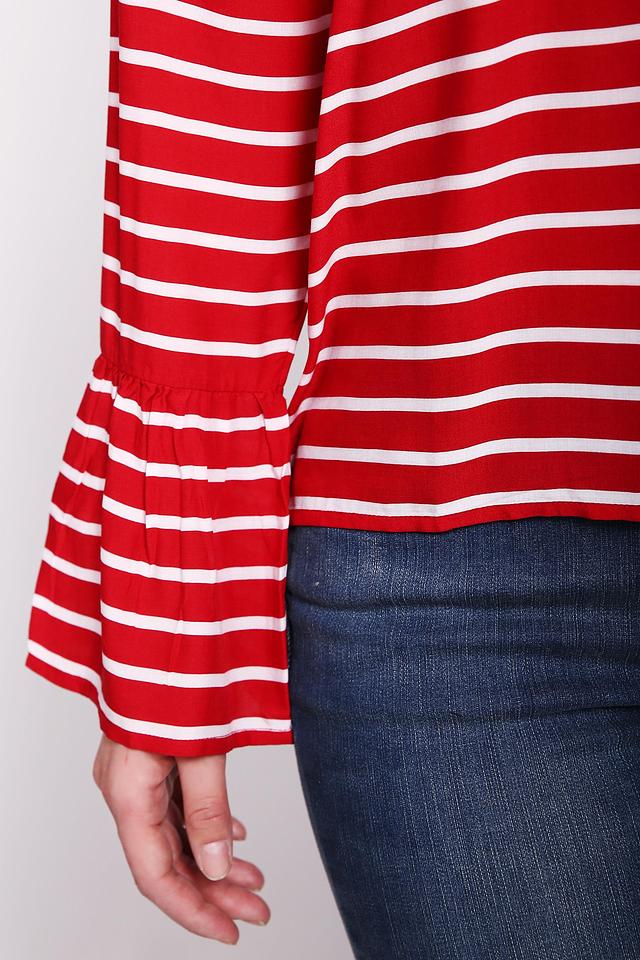 Блуза имеет яркий красный цвет с классическим белым рисунком в полоску. Длинные рукава дополнены изящными оборками, придающими образу женственность и лёгкость.