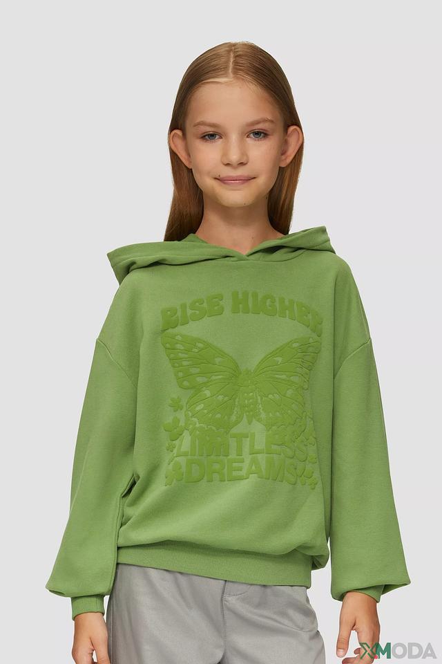 Худи s.Oliver – это стильная и удобная одежда для юных модниц. Эта модель выполнена в приятном зелёном цвете и украшена ярким принтом бабочки с надписями “RISE HIGHER” и “LIMITLESS DREAMS”.