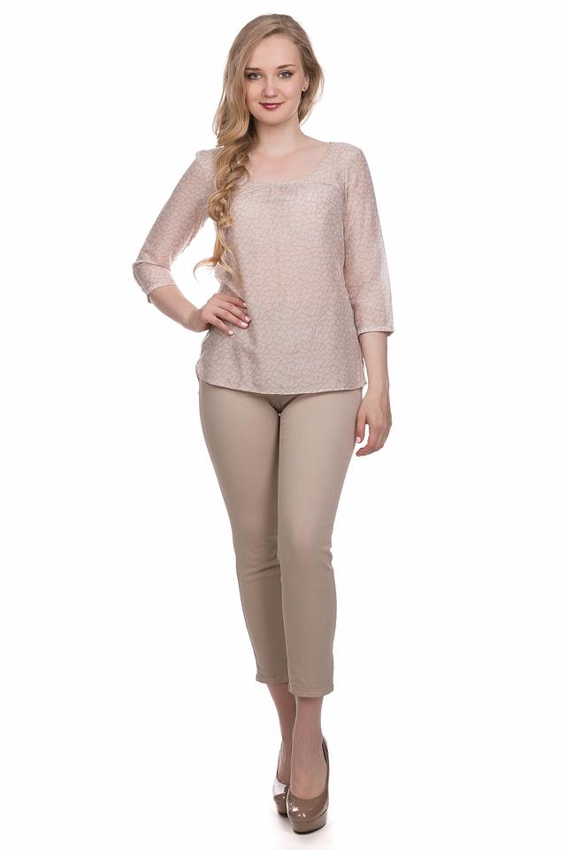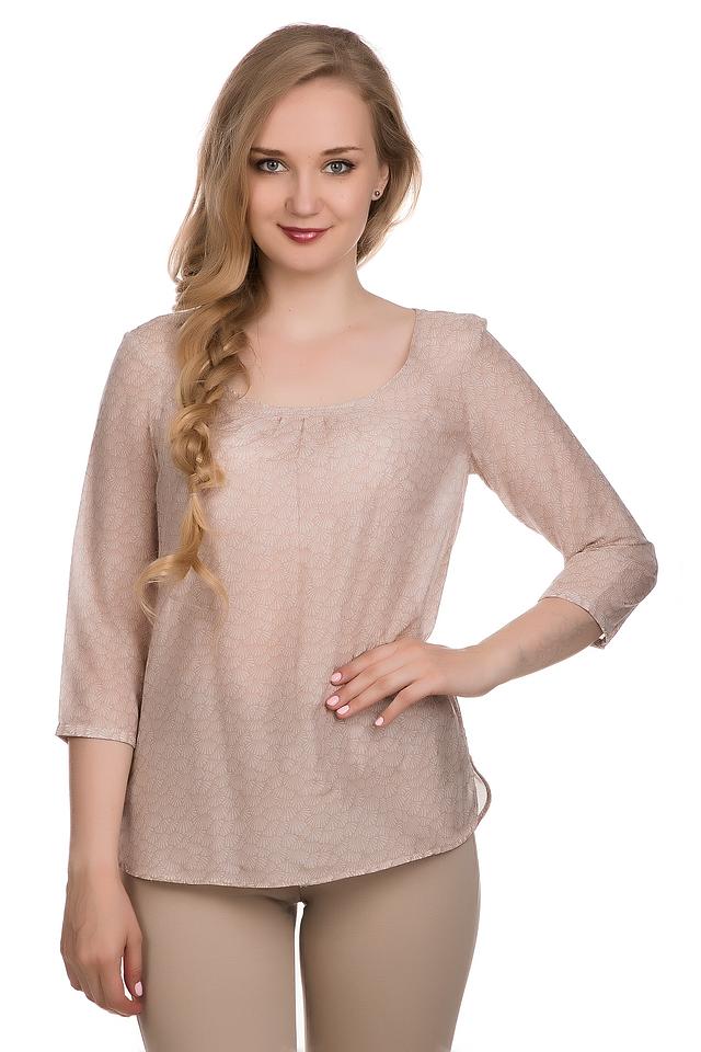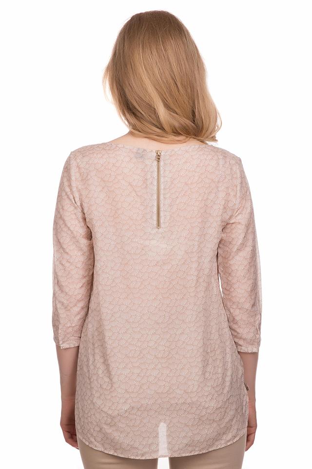 Блуза имеет квадратный вырез и рукава длиной три четверти. Сборки в области груди обеспечивают комфортную посадку по фигуре. Застежка на молнию расположена на спине.